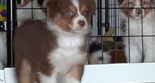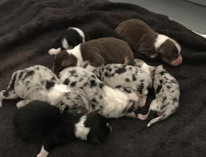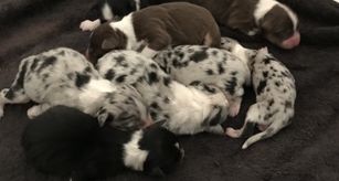 Our puppies include blue merle and black tri-color. Colors will vary depending on the parent dogs.