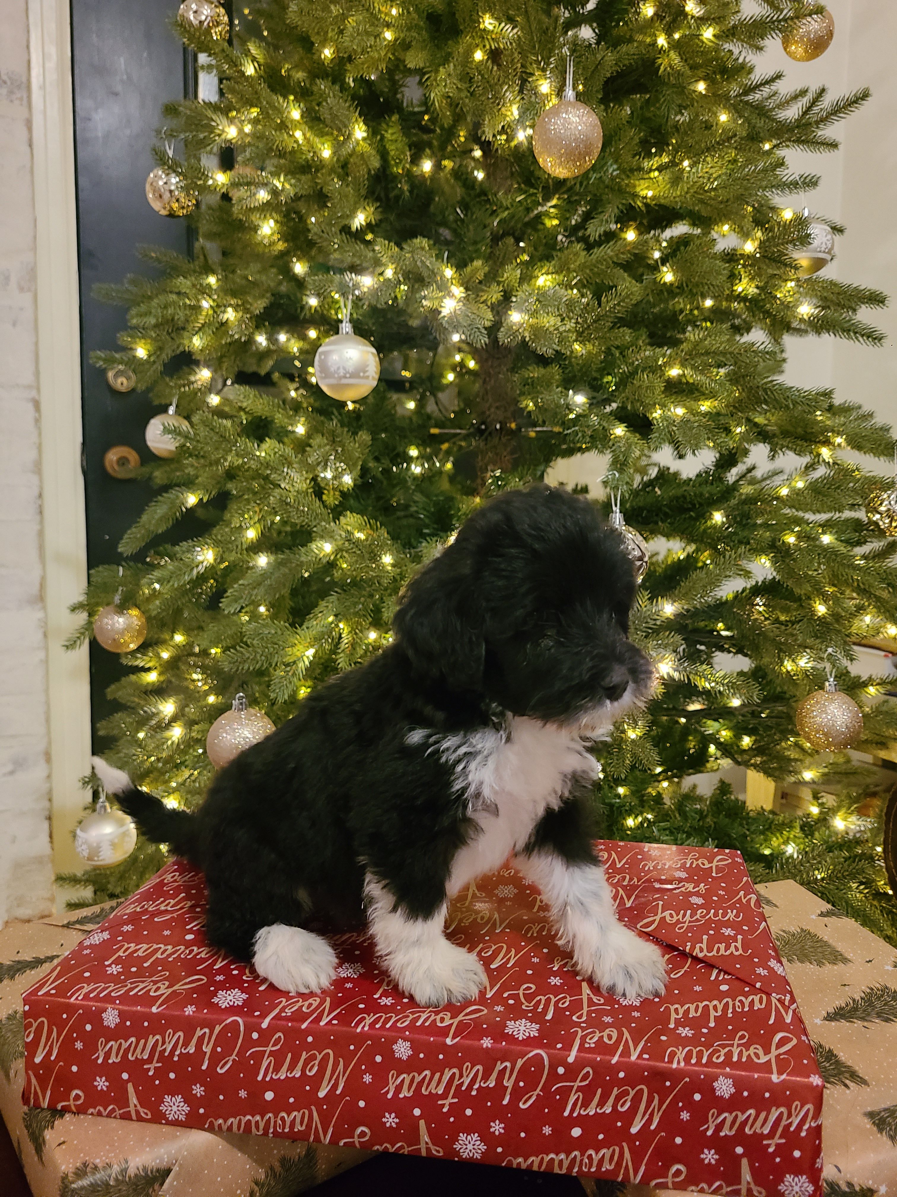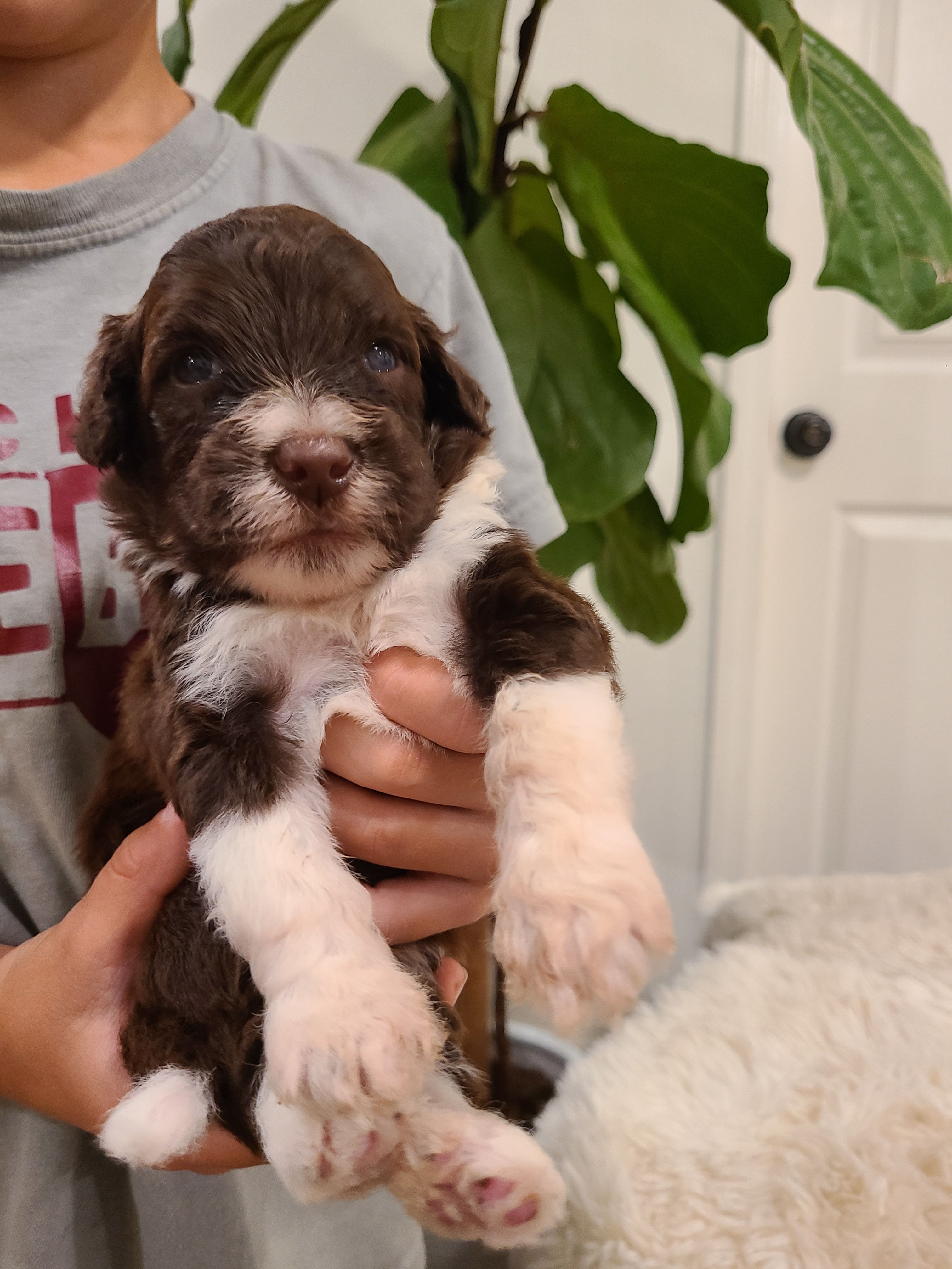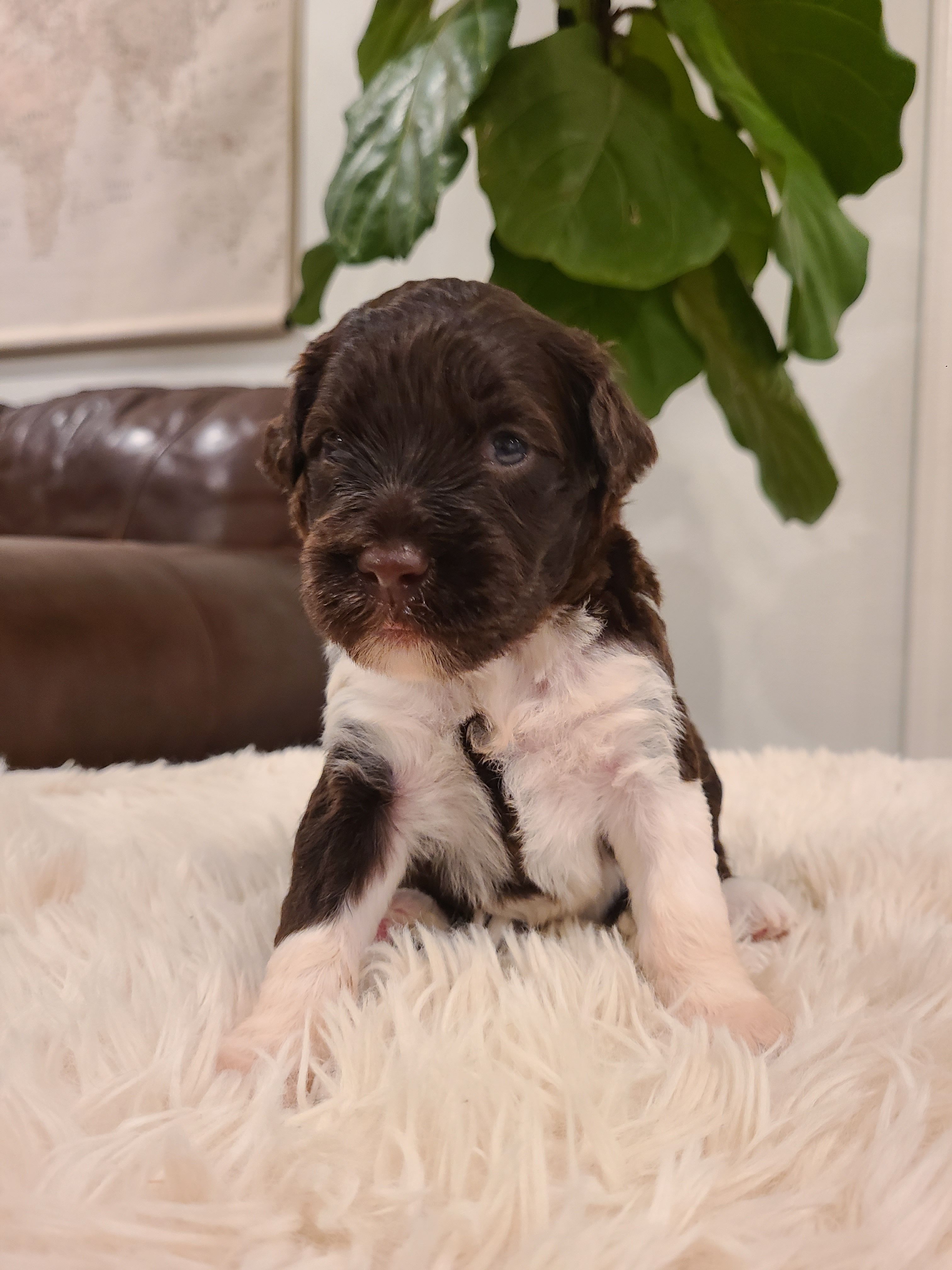 Portuguese Water Dog puppies include brown and white and black and white. Colors will vary depending on the parent dogs.