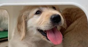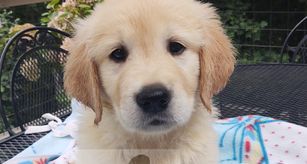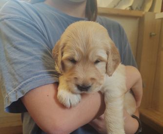 Our Golden Retriever puppies include dark golden and light golden. Goldendoodle puppies include cream, red, black, and parti. Sheepadoodle puppies include blue merle and white and black and white. Colors will vary depending on the parent dogs.