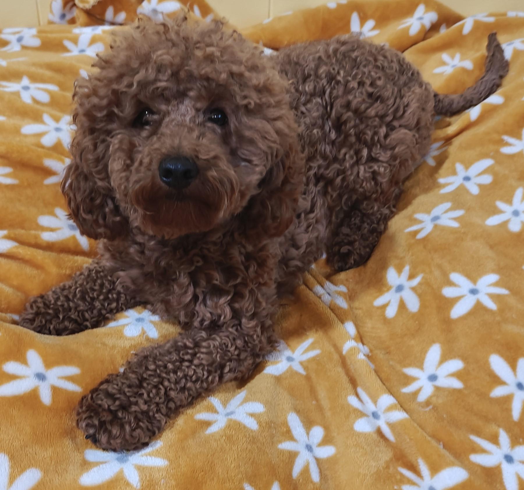 With her stunning curly red coat, Topanga is the picture of elegance and grace. Her coat, as vibrant as a sunset, complements her striking beauty, making her a true showstopper. Her intelligence shines through in her obedience and the ease with which she learns new things, proving she’s as smart as she is stunning.
