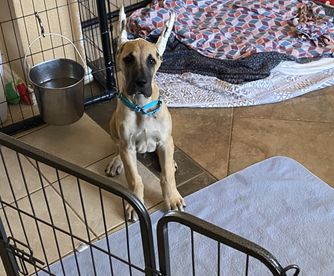 Great Dane puppies include brindle, fawn, and black. Colors will vary depending on the parent dogs.