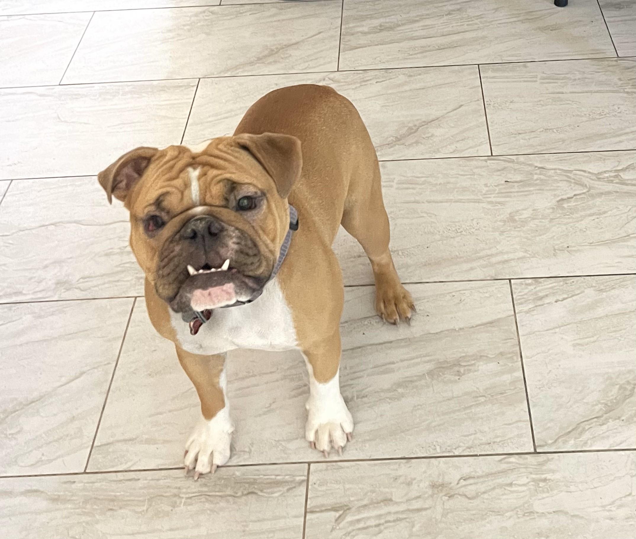 Adriana was amazing and we are very satisfied with our puppy! Our vet said she's actually got a really good nose for a bulldog, since they tend to have nose problems. She gets along great with our bigger dog and other dogs she's met. She also loves meeting new people! Beautiful colors and overall a good dog!