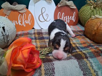 Our Dachshund puppies include piebald, black, chocolate, black and tan, chocolate and cream, black and cream, and dapple. Basset Hound puppies are black brown and white. Colors will vary depending on the parent dogs.