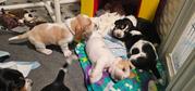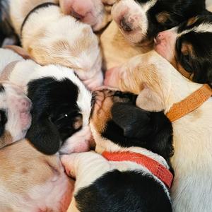 Our puppies include red and white, lemon and white, and black brown and white. Colors will vary depending on the parent dogs.