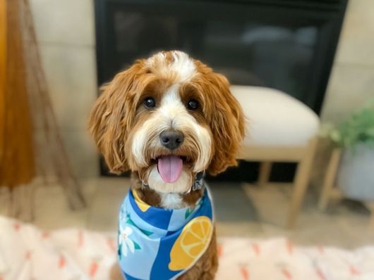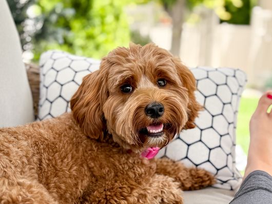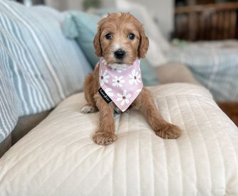 Daisy is our 15 lb. Goldendoodle. She is the sweetest girl. Full of personality. She loves to go to work everyday with her mom and loves watching over the day to day work. She loves to snuggle with her humans and going to watch the soccer games.