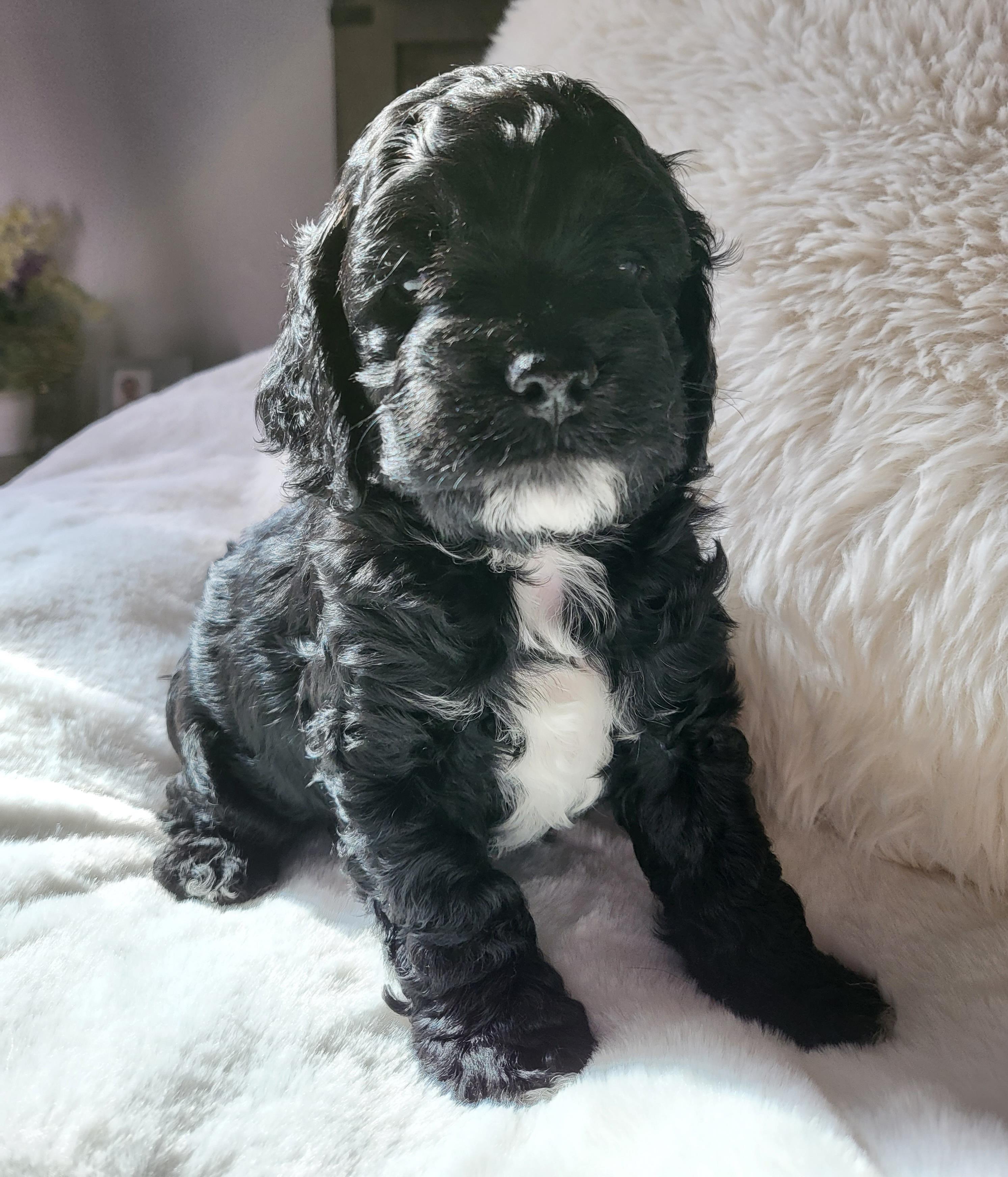 Our Cavapoo puppies are red. Cockapoo puppies include buff, black and white, and buff and white. Colors will vary depending on the parent dogs.