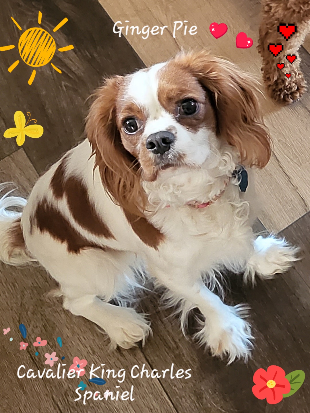 Our sweet, sweet Ginger Pie. She is quiet but also very playful. She loves to play in water and chase butterflies ( and grasshoppers, crickets, or any other flying, or hopping insect) it is so cute and fun to watch her. She was bred to be a lap dog, and she is perfectly content sitting on you or beside you. She also loves to go on walks or for a car ride, anywhere really as long as she's with her family. The Cavalier King Charles breed is very, very laid back and super super sweet.