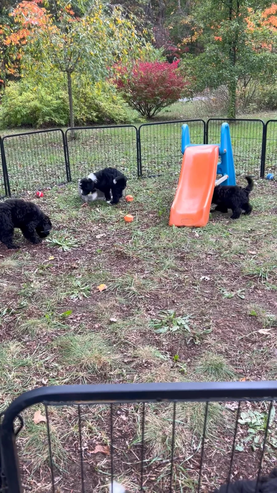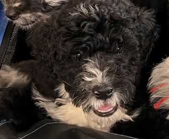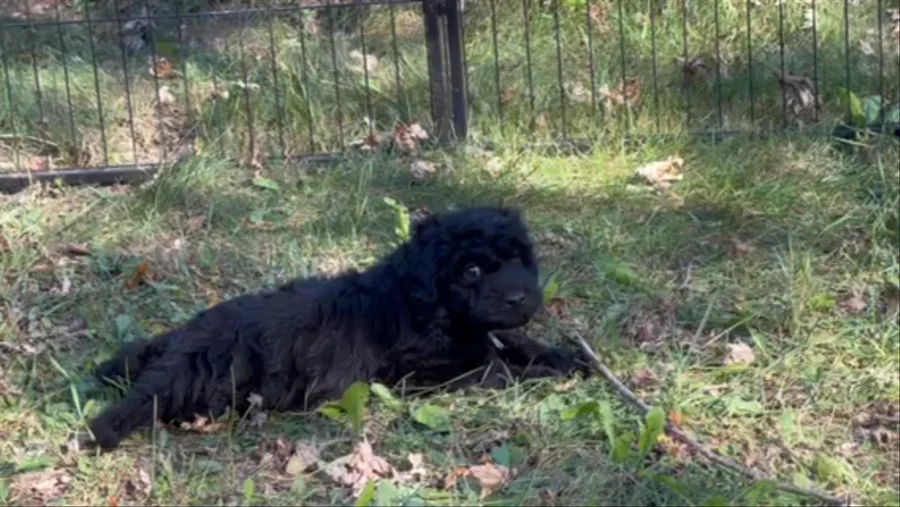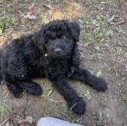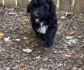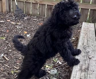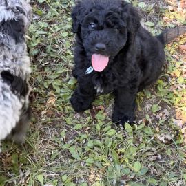 Lava is a stunning jet Black pup with just a snip of white on his chest. He will be quite curly. He honestly looks like a stuffed animal and is so so sweet and affectionate! He’ll be fairly small, likely 30-35 lbs. The perfect size for adventure or snuggling.
