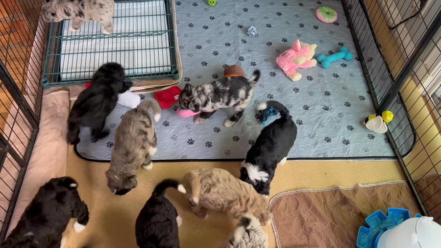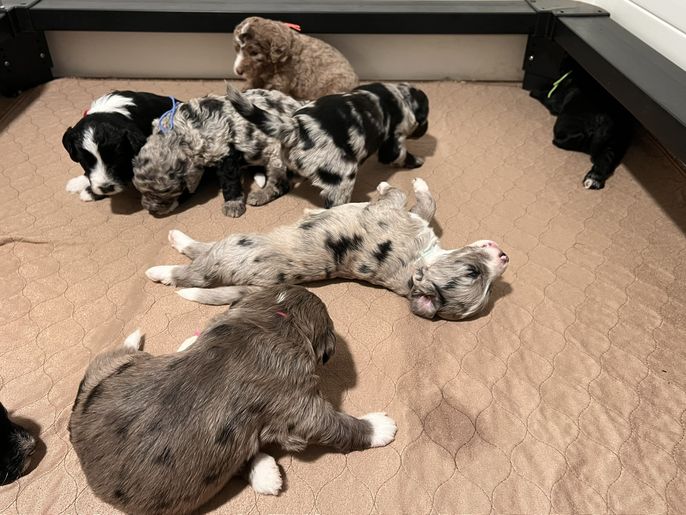 Our puppies include apricot, brown and white, blue merle, red merle, black and white, and black tri-color. Colors will vary depending on the parent dogs.