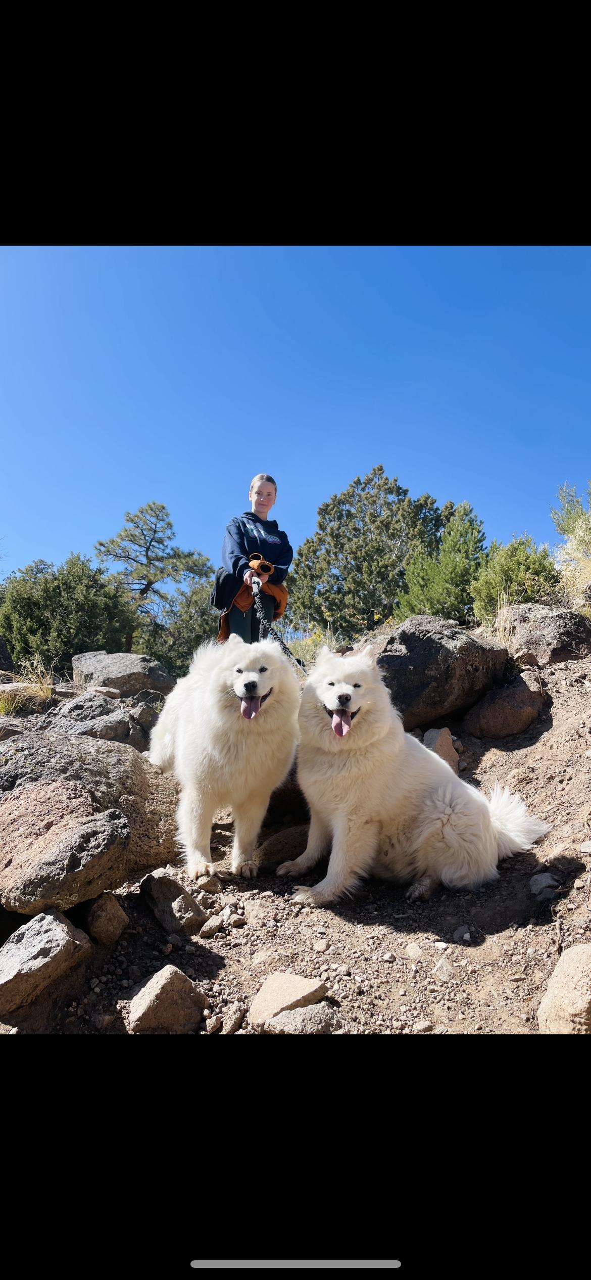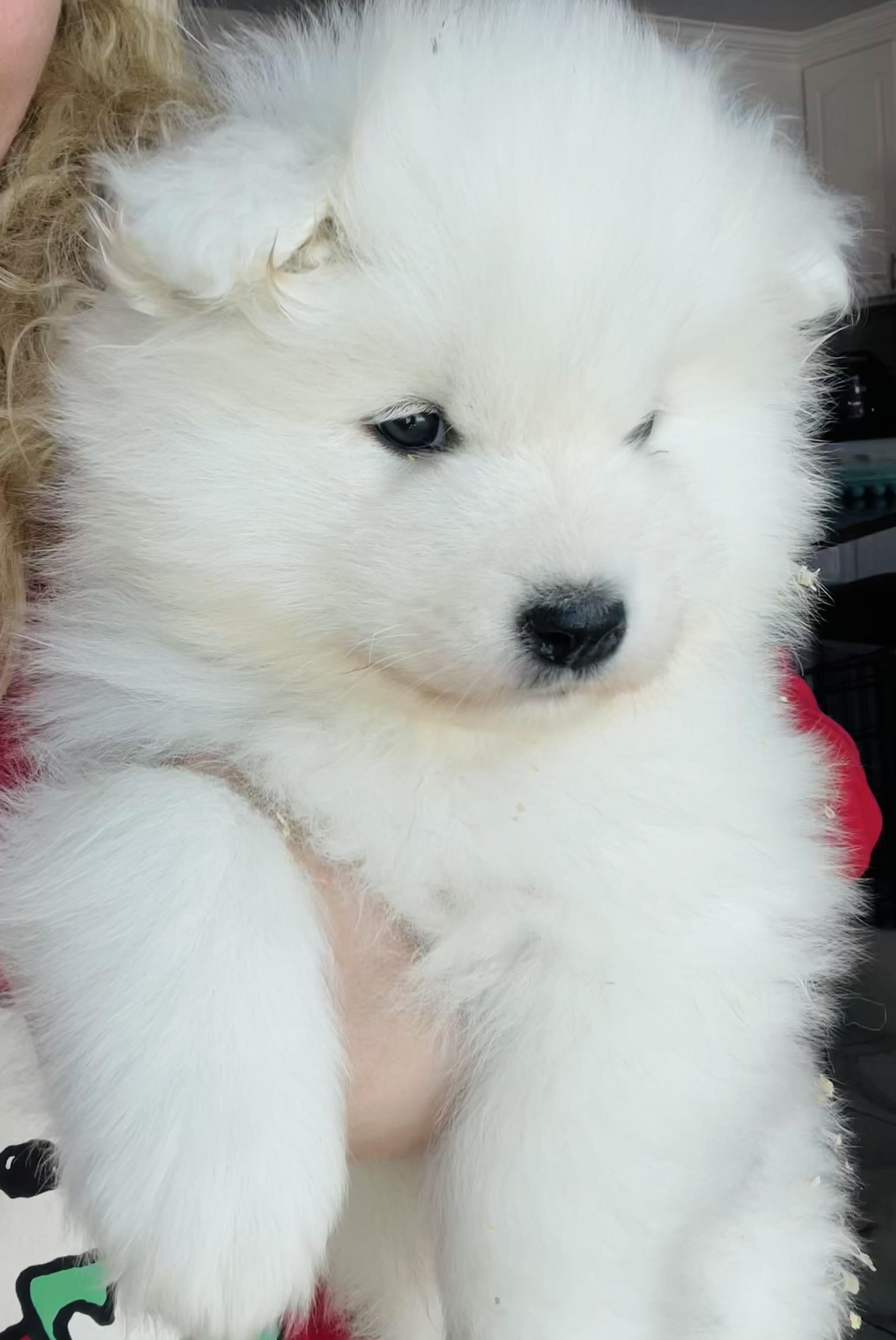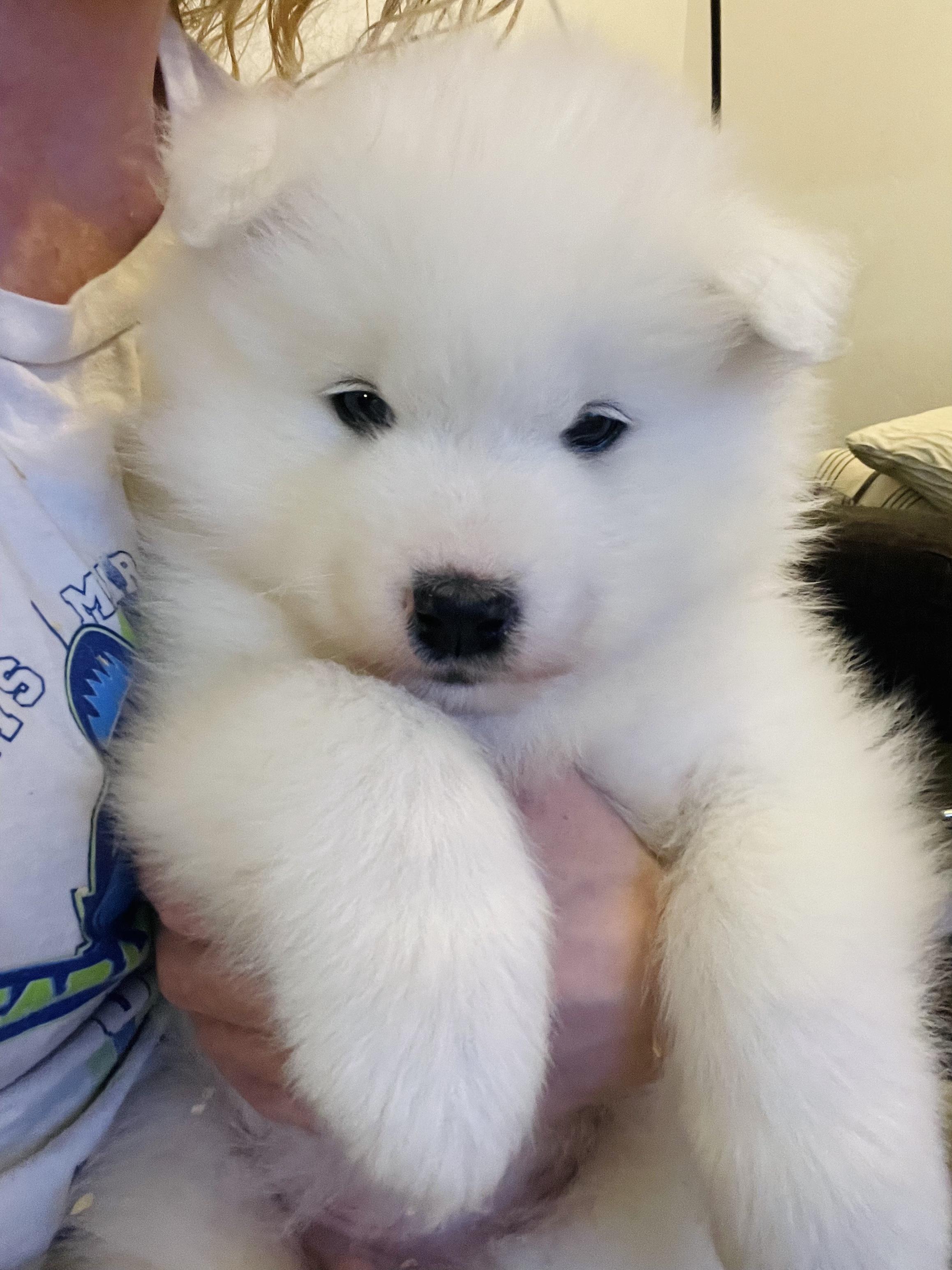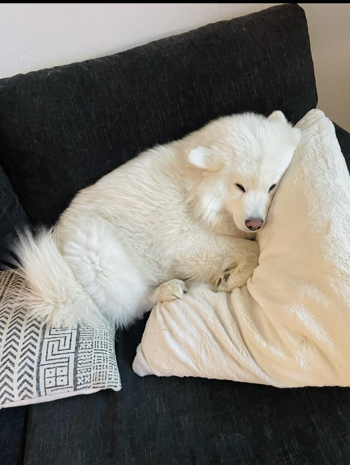 Oh our beautiful Luna bear! We are anticipating puppies with our sweet, beautiful, ever-so soft, more human than dog like, talkative, loving, social, calm demeanored, active happy go lucky, yet a couch potato of a lady. Luna has the absolute best disposition, not to mention is kind of like a therapy dog with how soft she is. She is wise beyond her years and is particularly tuned into humans. She is a nurturer and was born to be a momma. A momma to cats, humans, and puppies- she will take them and take care of them! We love her and her heart so much. Luna has also had a full embark genetic panel done which came back with flying colors clearing her of more than 200 inherited diseases that are more apt to be in the Samoyed genes. She is also OFA hip/elbow certified .