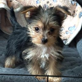 Palmer is an AKC registered choclate parti Yorkshire terrier. Both of her parents have been tested.