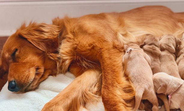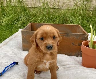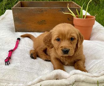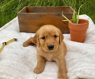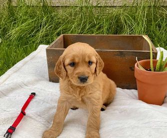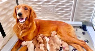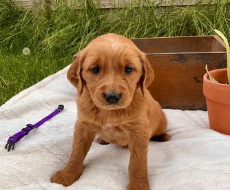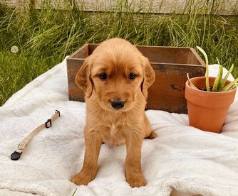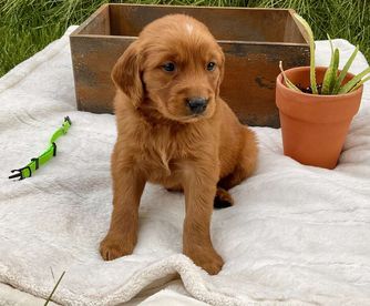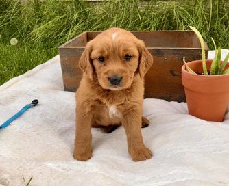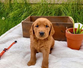 Willow has passed all of her health tests successfully through parentage, and she is registered with the American Kennel Club (AKC). Willow perfectly resembles a field-bred golden retriever. This means that she has long legs, a long muzzle, and a slim build. Willow has adorable, expressive brown eyes with black liner around them to make them stand out, as well as a black nose and black paws. Another thing she inherits from the field-bred retrievers is her short, low-shedding coat. It is extremely low maintenance, velvety soft, and waves slightly around her ears and tail. Willow is a smaller-sized golden retriever, only weighing 53 pounds and standing 20" at the shoulder. All of these traits, combined with her stunning red coloring and stellar genetic lineage, make her the perfect Miniature Golden Retriever mama!