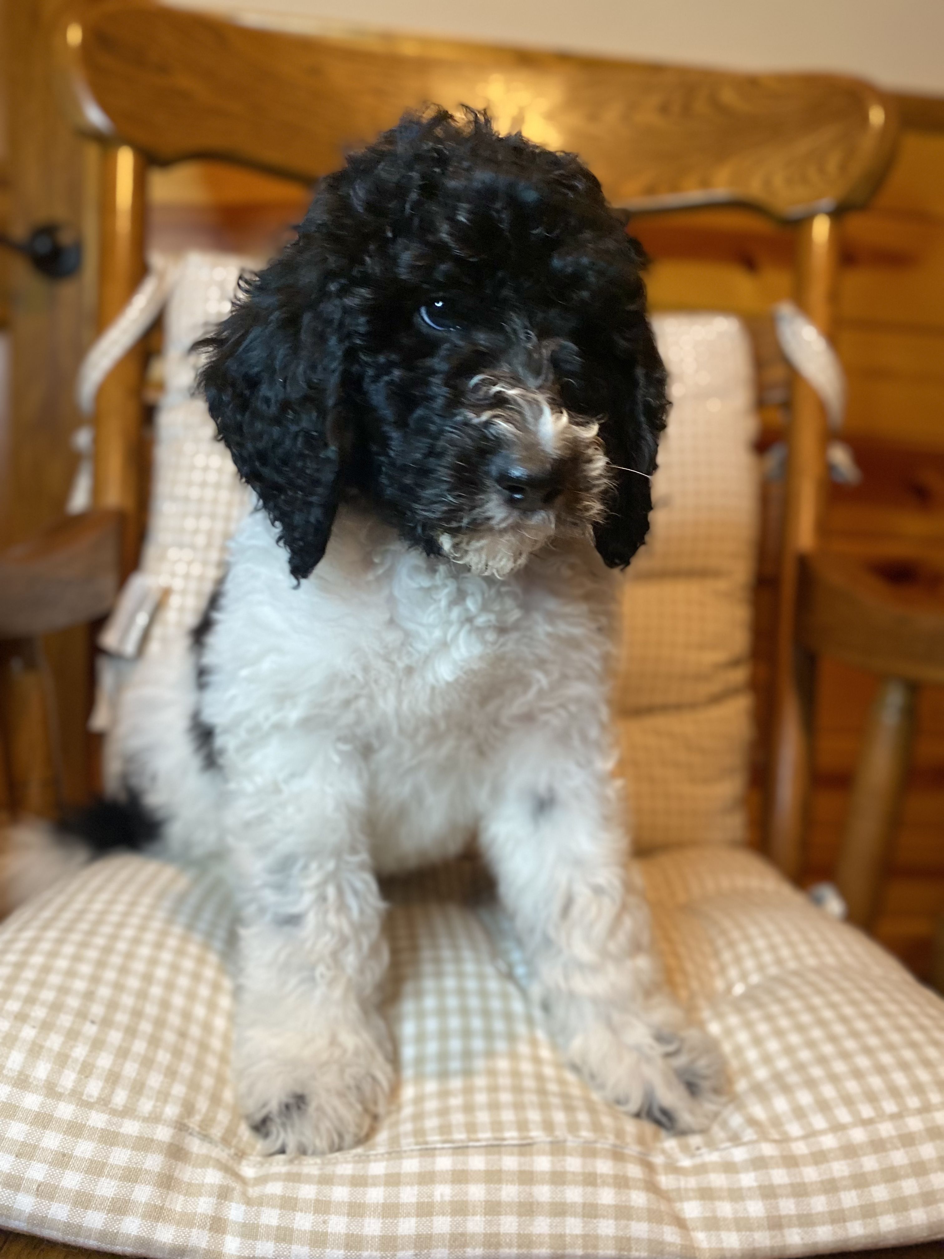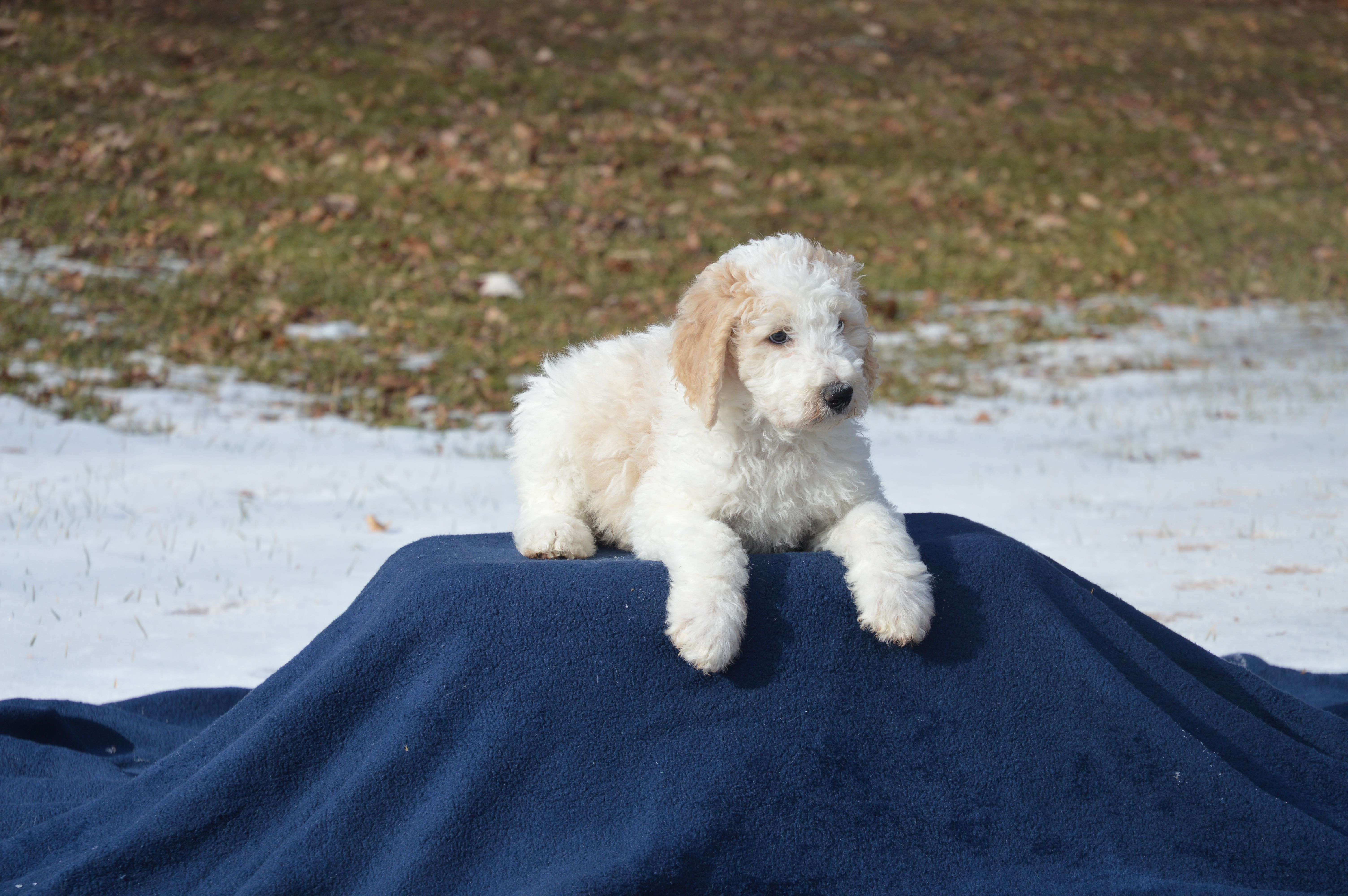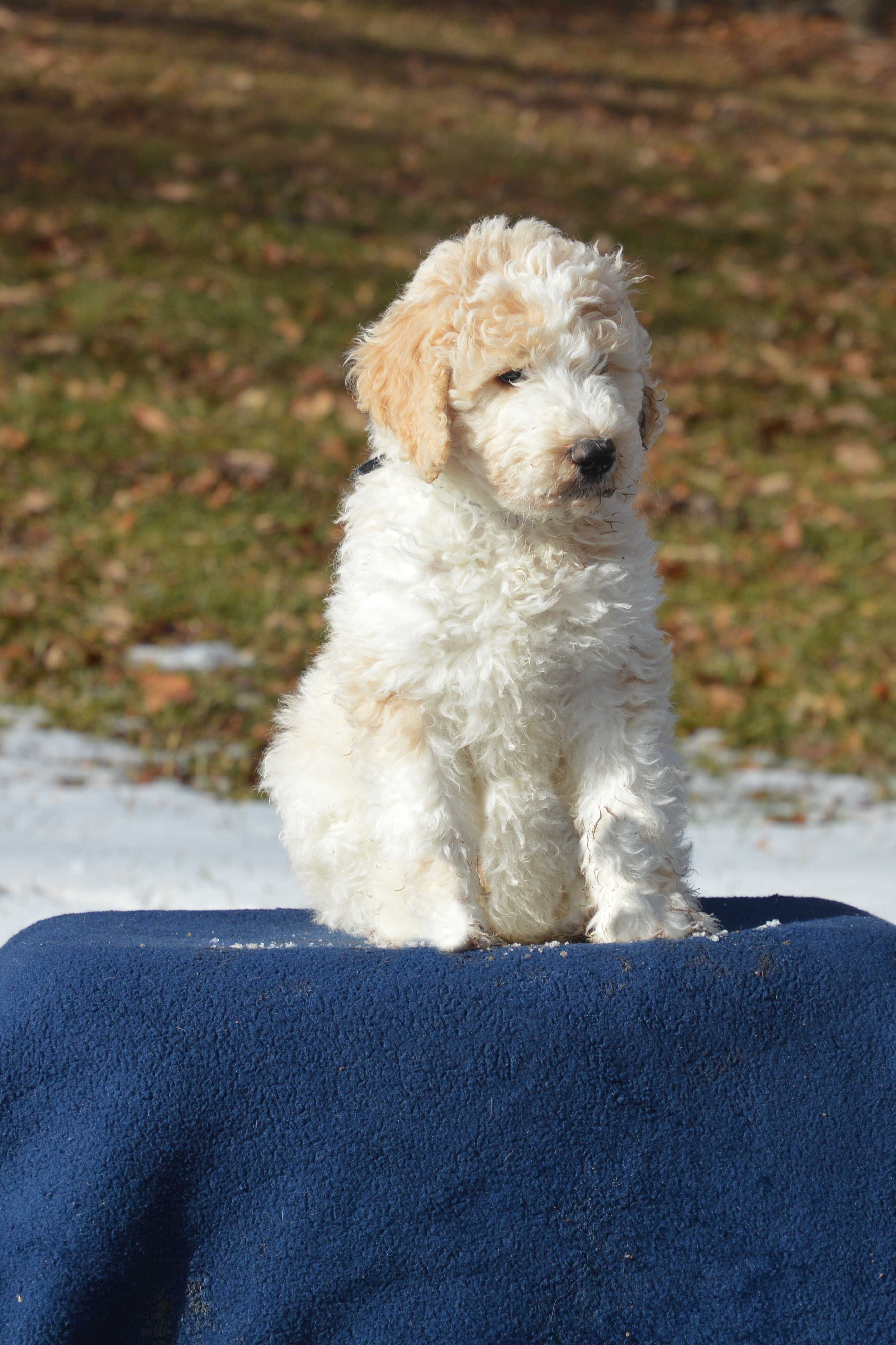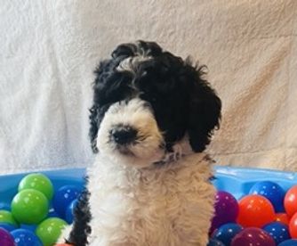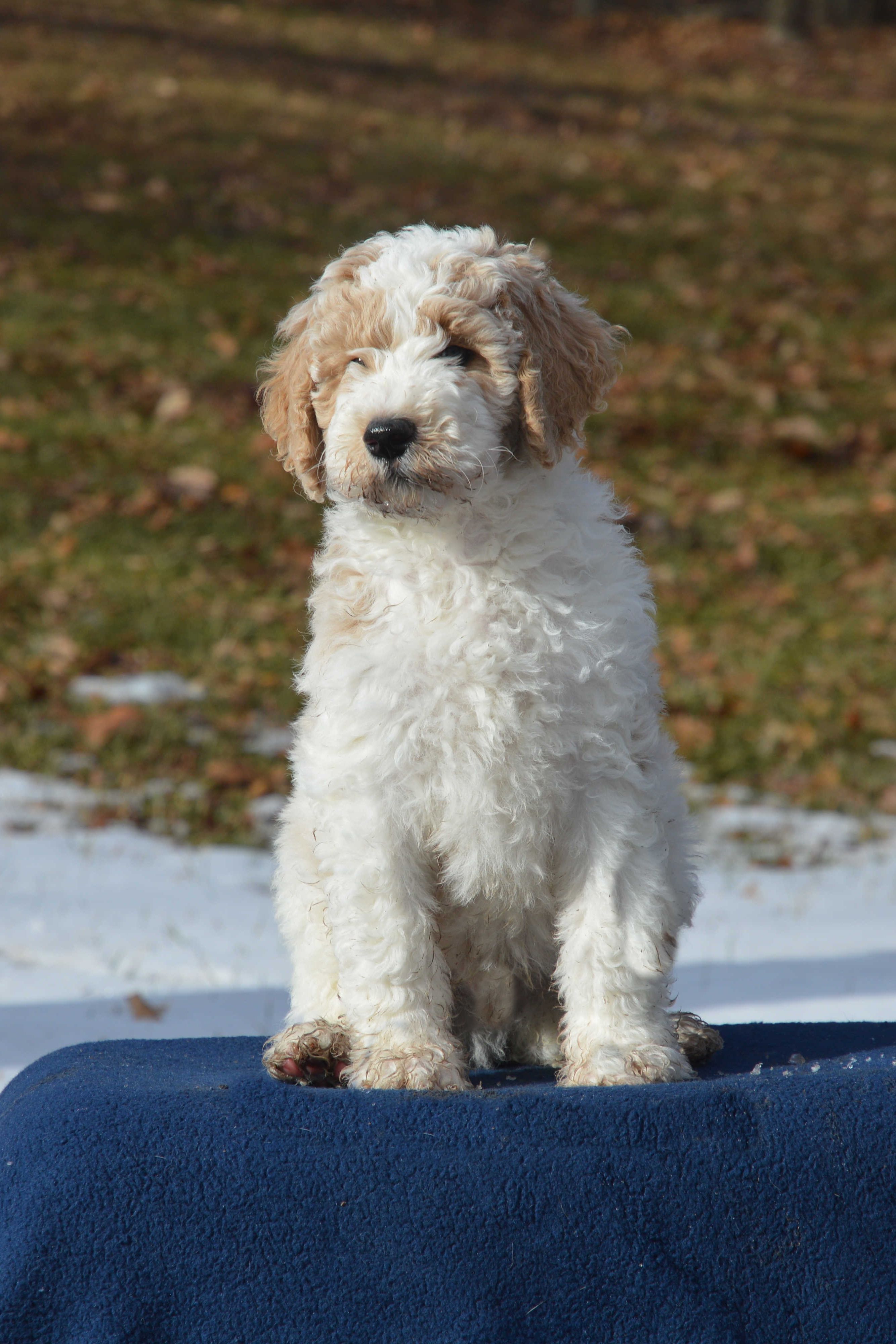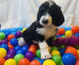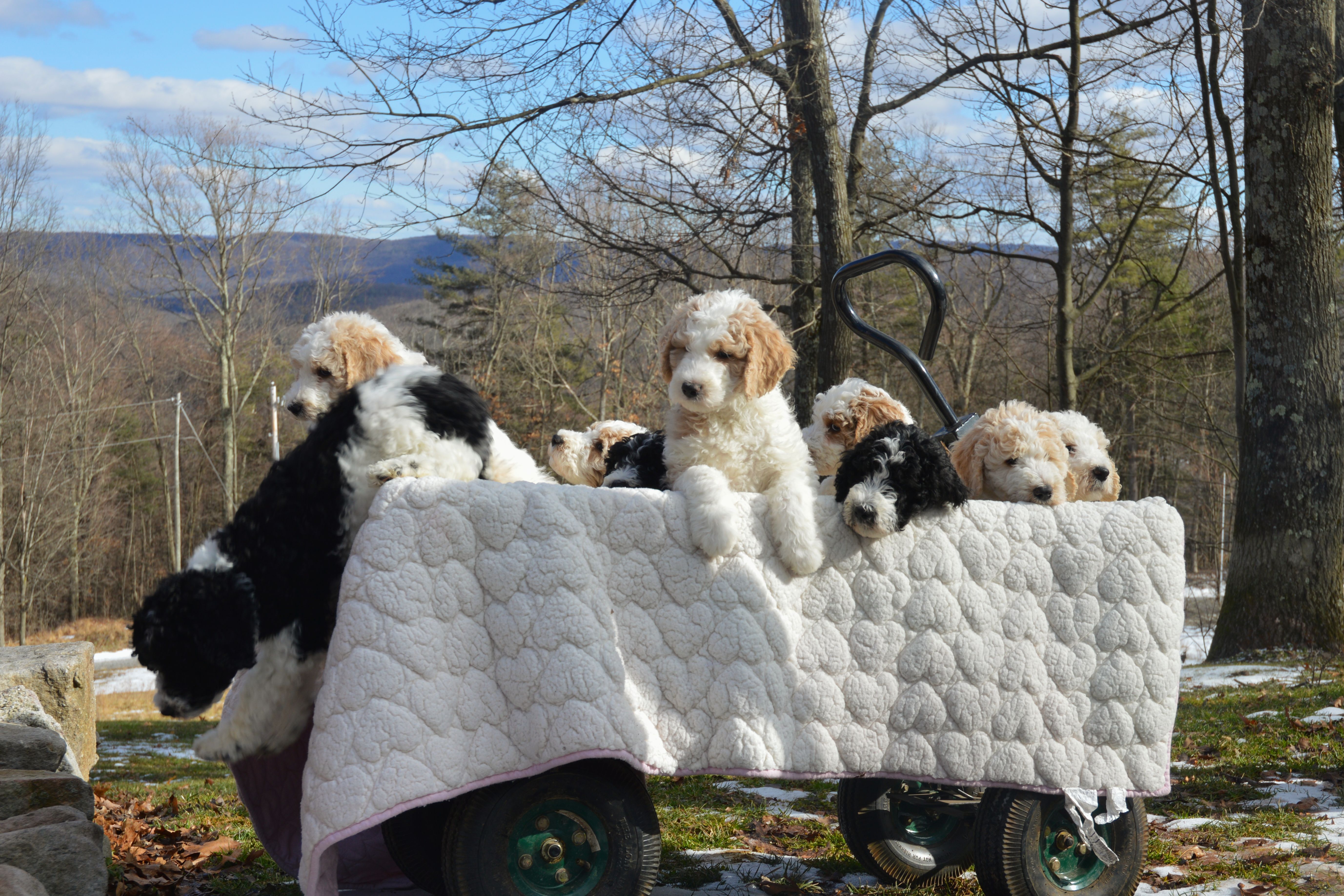 Our Bernedoodle puppies include black and white, tri-color, and phantom. Goldendoodle puppies include cream, red, black, and parti. Colors will vary depending on the parent dogs.