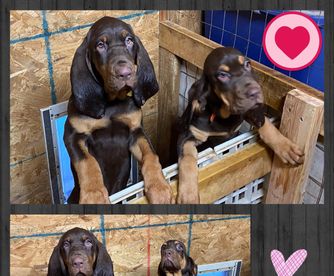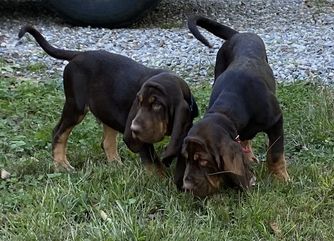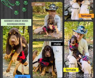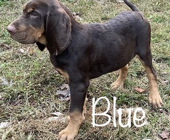 Our Australian Cattle Dog puppies are blue. Bloodhound puppies include red, black and tan, and liver and tan. Colors will vary depending on the parent dogs.