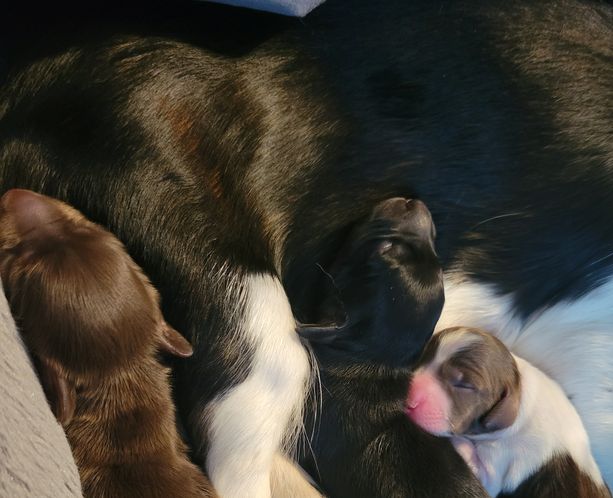 Our puppies include piebald, chocolate, brindle, and chocolate and tan. Colors will vary depending on the parent dogs.