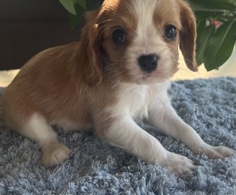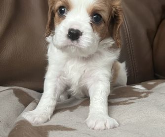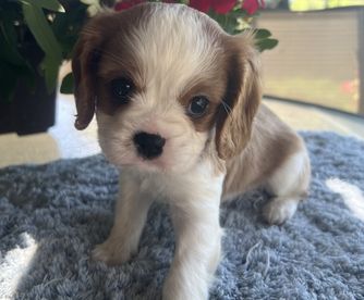 Chaz is our handsome Blenheim Cavalier King Charles Spaniel with a warm, affectionate nature and a big heart. He thrives on attention and loves being around people, always eager to be part of whatever you’re doing and happiest when he’s close by. With his classic chestnut-and-white coat and gentle expression, Chaz wins everyone over instantly. His loyal, people-focused temperament makes him a wonderful companion and a shining example of the Cavalier’s loving spirit.