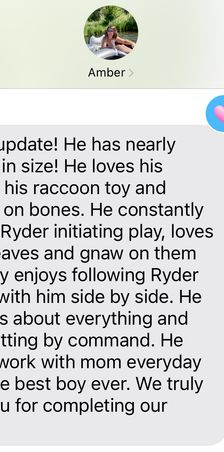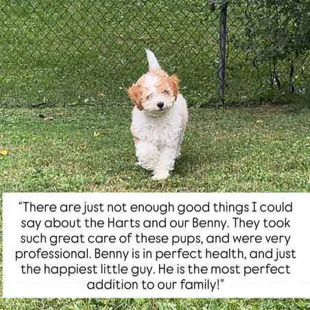 10000/10 would recommend getting a puppy through this family. From the very beginning, they were professional, responsive, and clearly passionate about what they do. You can tell the puppies were raised with lots of love and care. They went above and beyond to make sure we were comfortable and informed every step of the way. We felt truly supported throughout the entire process. Our puppy is healthy, happy, and has the sweetest temperament - a true testament to this family and early care. Thank you Hart family!!!!! Now I need to convince my sister to get a puppy too :)