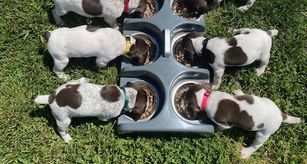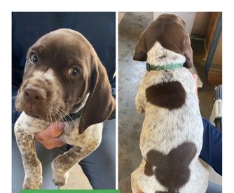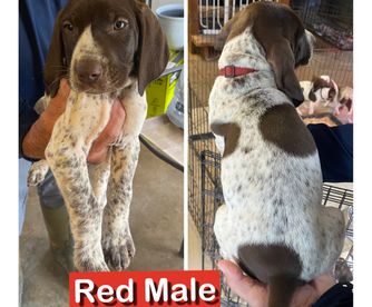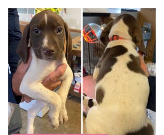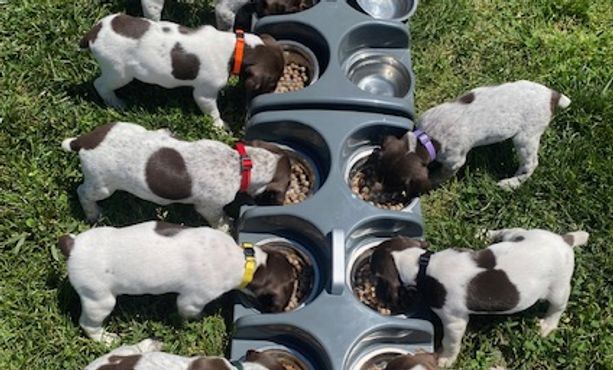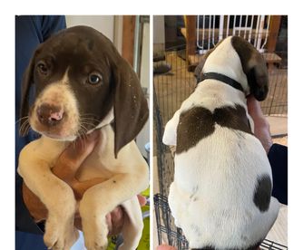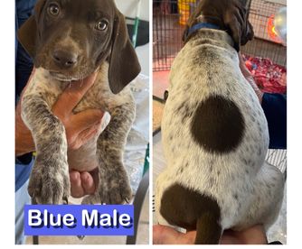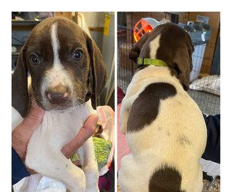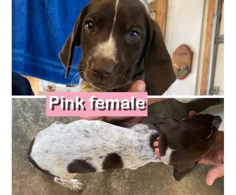 Our puppies include liver roan and liver and white. Colors will vary depending on the parent dogs.