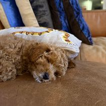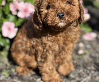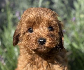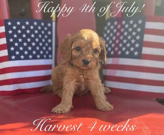 Meadow is a very sweet F1 Cavapoo with big Cavalier eyes. She's the daughter of Stella and Dash, and was born and raised at Harvest Creek. She loves to hang with the family, play outside, and go for walks.