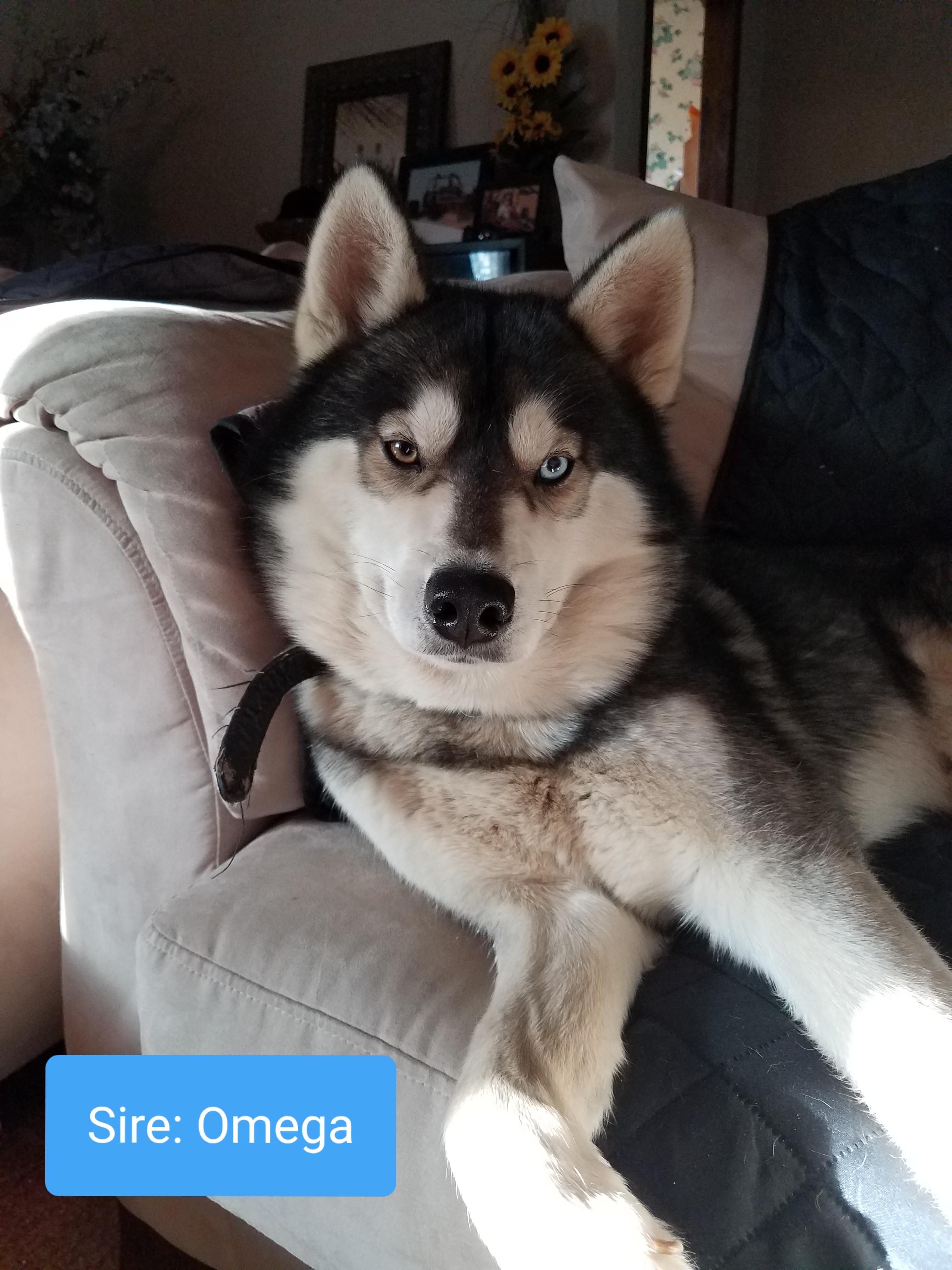 Omega is a male Siberian Husky. Carefully selected as a great representative of his breed, Sarah decided to make him part of their program. Sarah has passed Good Dog’s screening process, which involved a review of their breeding practices, environment, and the mental and physical health of their dogs.