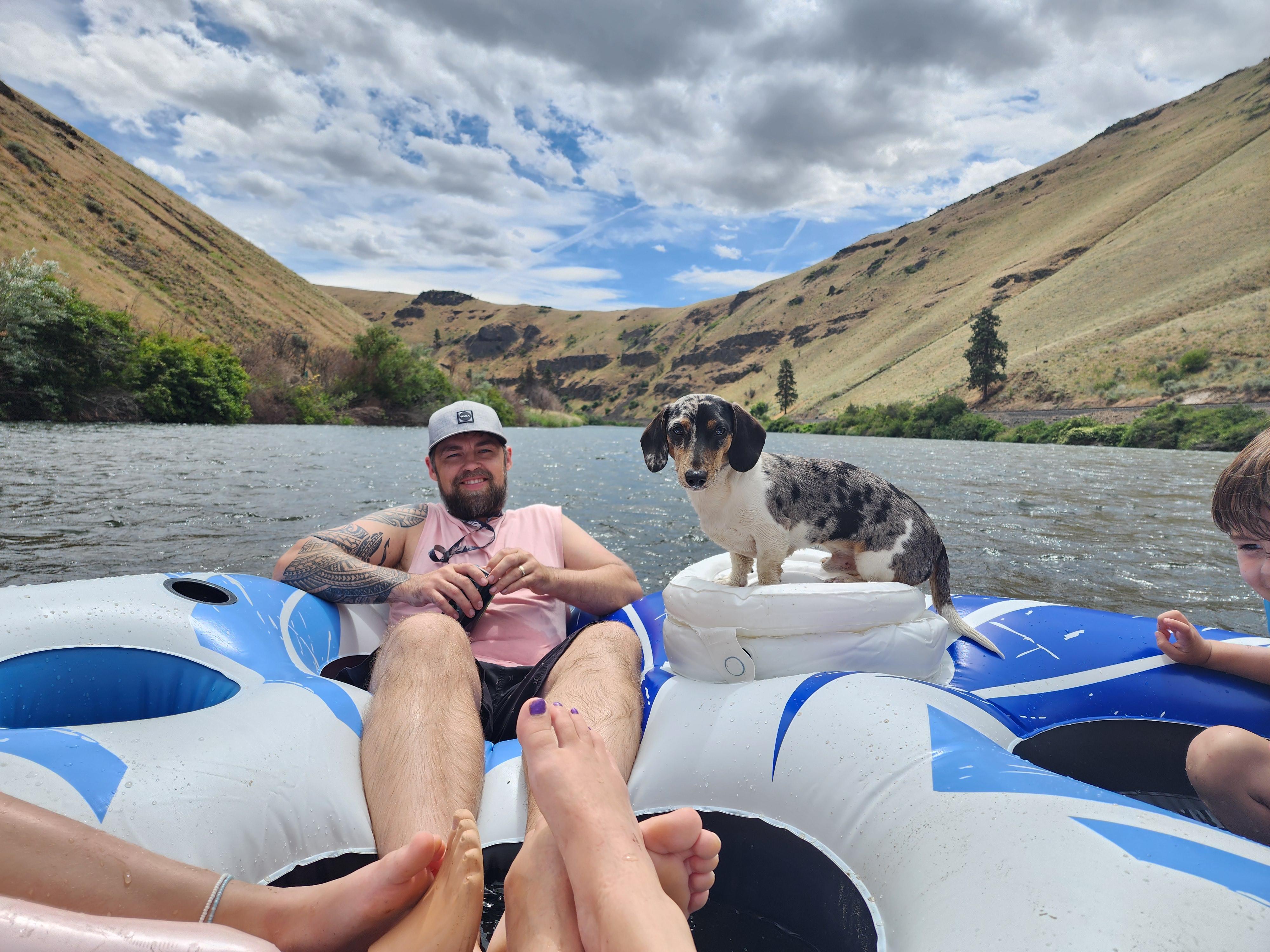 Toby is a total lap dog and daddy's boy. He loves car rides and playing in rivers. He's great with kiddos and well mannered.