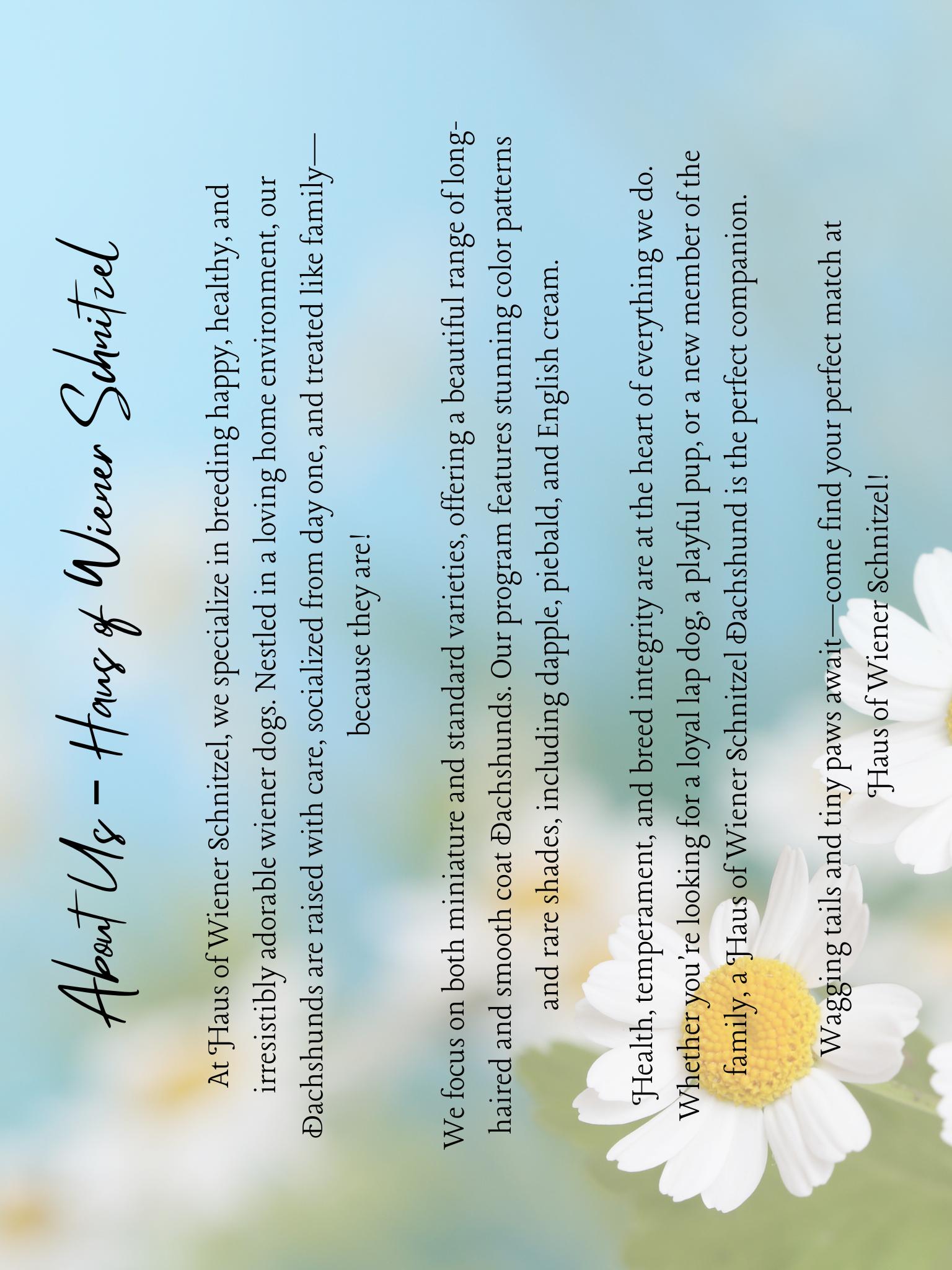 I'm Chloe B., the breeder behind Haus of Wiener Schnitzel located in Port Orchard, WA. We’re a small, family-run breeding program devoted to raising beautiful, healthy Dachshunds with love and intention. We specialize in miniature and standard wiener dogs—including long-haired and smooth coats in stunning dapple, piebald, and English cream. Our pups are raised in our home, cuddled daily, and treated like family—until they become part of yours.