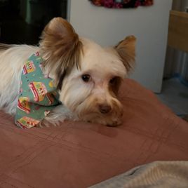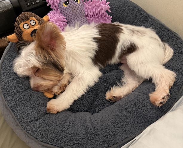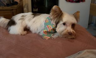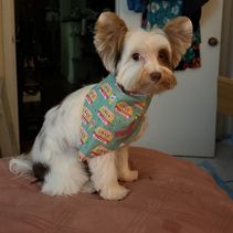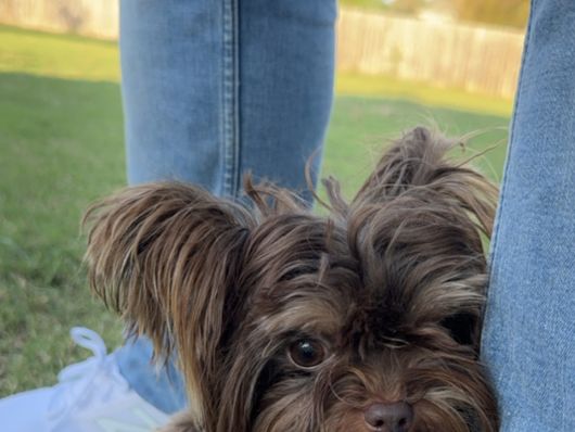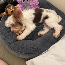 Masha a such a good mom and is the sweetest lap dog. She is a 6 pound female AKC chocolate Parti yorkie that carries blonde.