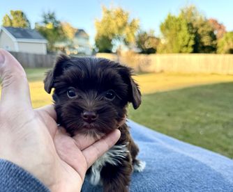 Bear is a 4.5 pound male AKC chocolate yorkie who carries parti.