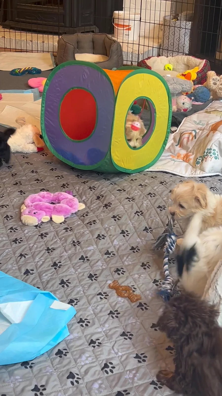 We are a small, in home-based breeder devoted to giving each puppy the best possible start in life. All of our dogs live inside our home as treasured family members. They cuddle by the fireplace, go on fun car rides, and enjoy daily affection and care. Our pups also have access to a spacious, playful backyard filled with toys, a playhouse, a slide, and even a caterpillar tunnel they absolutely love.
