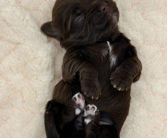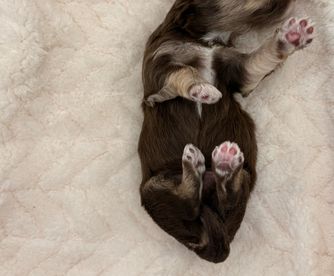 Maggie is a beautiful light chocolate female from AKC Champion bloodlines out of Hungary. She has a chocolate nose and darling brown eyes. She weighs 14 lbs. Her hobbies include giving and receiving affection, sitting in as many laps as possible and chasing critters out of the yard. 😂