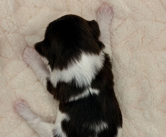 Jazzie is a very sweet, fun-loving dog. She is the daughter of Tuxedo and Tiara. She loves to take off at a dead run to jump in my lap to give kisses. I call these moments “Jazz attacks.” 🤣 She loves to chase and be chased around the yard. Her favorite activity in the fall is rolling around in a pile of leaves. She’s full of energy and makes me laugh with her silly antics.