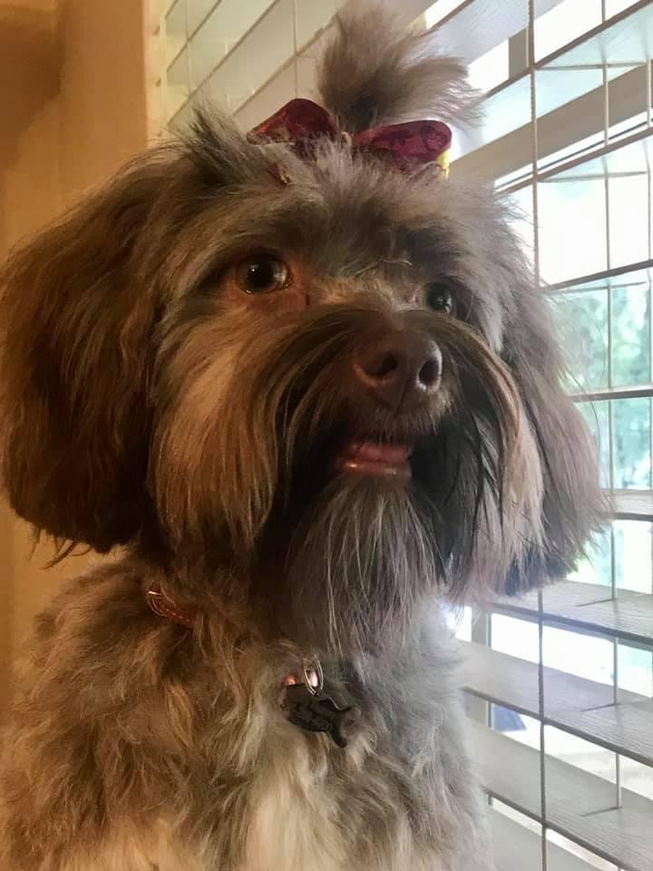 Bogey is our playful sweet boy and sire. He is a gorgeous chocolate brindle with white markings. He has beautiful hazel eyes and thick wavy hair. He has the best temperament, so affectionate and happy. He loves to cuddle and play. Bogey is from a grand champion line. He is 13 lbs. AKC