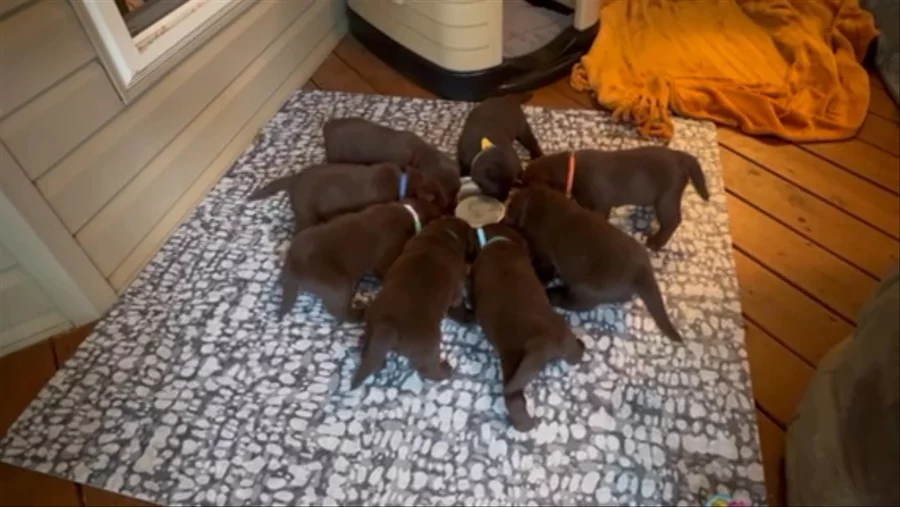 Puppies are 5 weeks old. They are moving from puppy gruel once a day to puppy mush twice a day. They still are very polite when eating together.