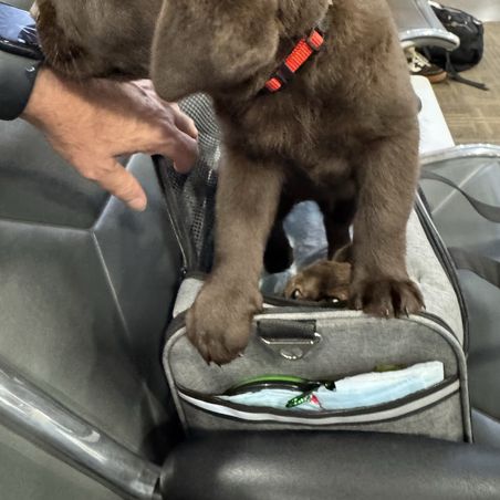 The puppies are going to their new homes. Here’s a pic of one flying like a seasoned traveler.