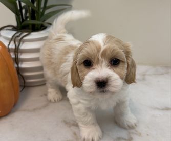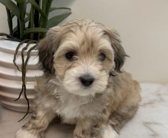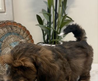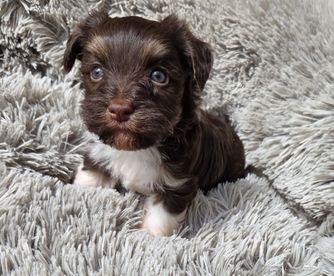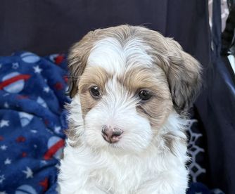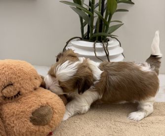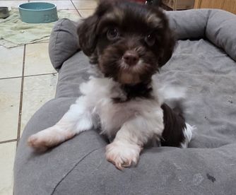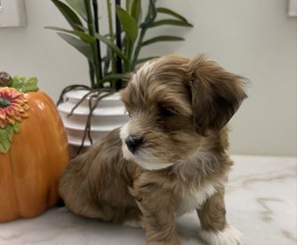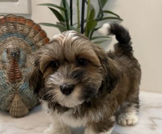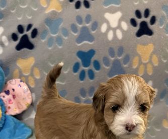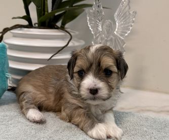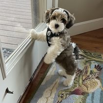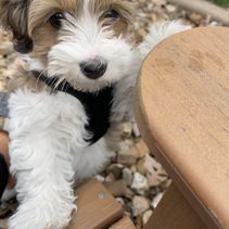 Asher is an energetic, happy boy with numerous champions and grand champions in his pedigree. He has a great temperament and is a very social boy. He is a red sable AKC registered Havanese with white markings.