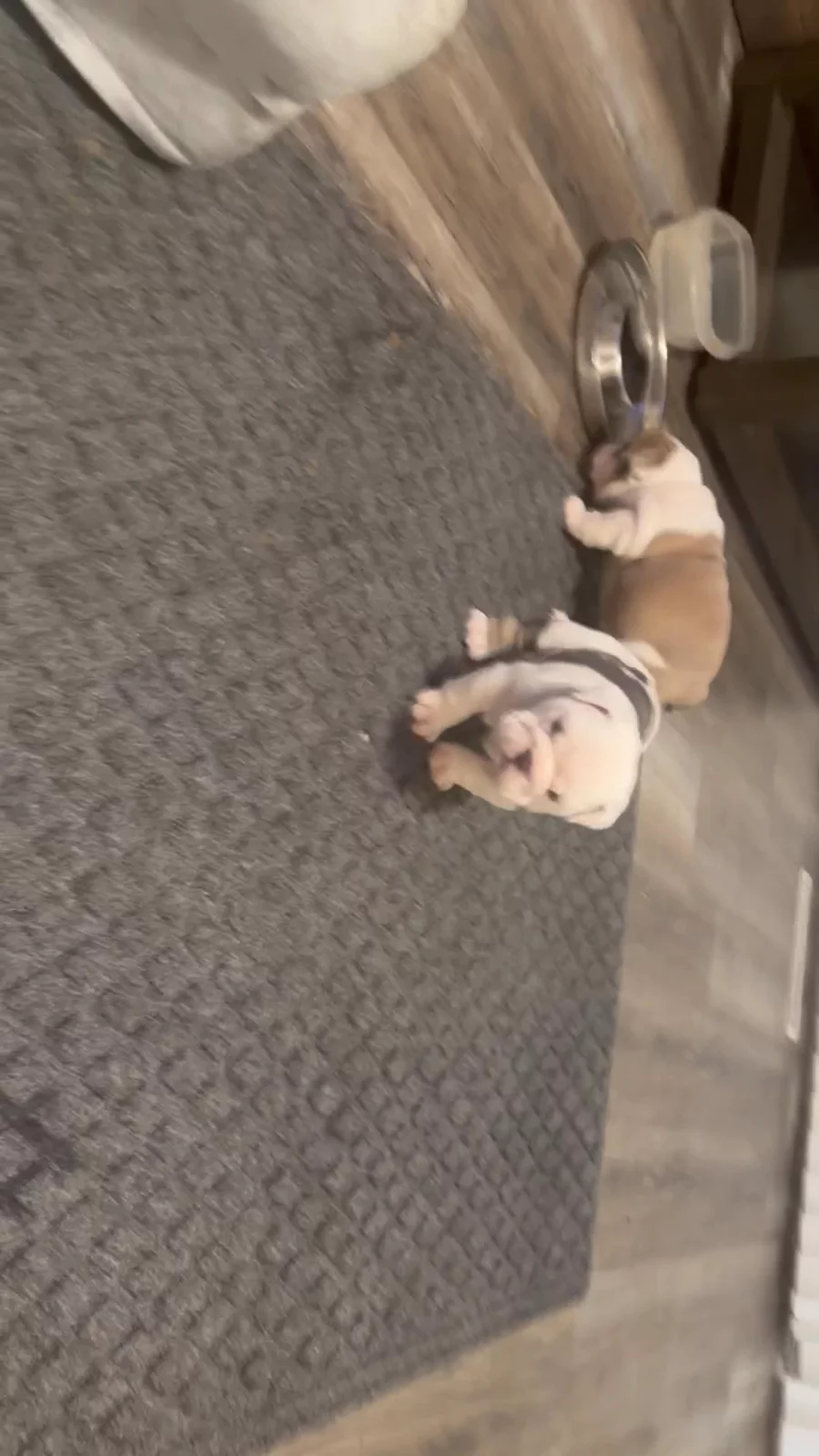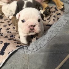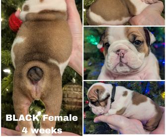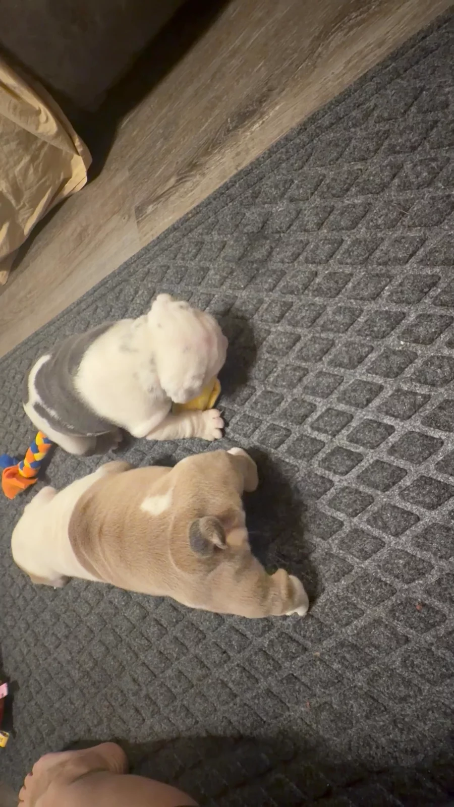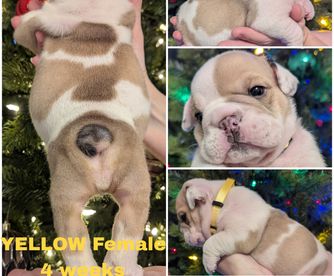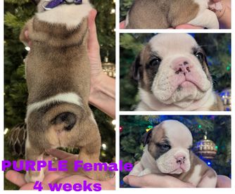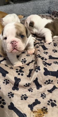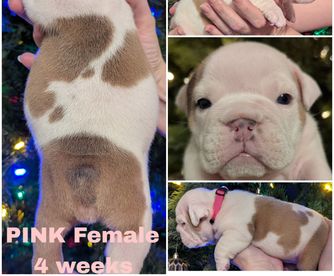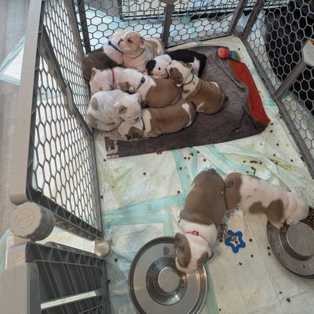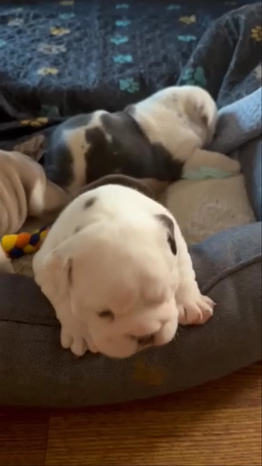 The girls are 4 weeks old today 11/20/25 and are doing wonderfully! They are getting better each day learning to walk. They have started the transition to mush and then top off on mom. They had their 2nd round of dewormer today and will have the final dose at 6 weeks when they also have their health check and first set of vaccines. They are starting to have their own personalities and also starting to play more verses just sleep and eat. They will be running around the house playing with the other English Bulldogs in my house in no time. Their favorite pass time is still eating, sleeping, and snuggling with mom or with me and my husband. I hope to be able to start potty training around week 5.