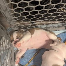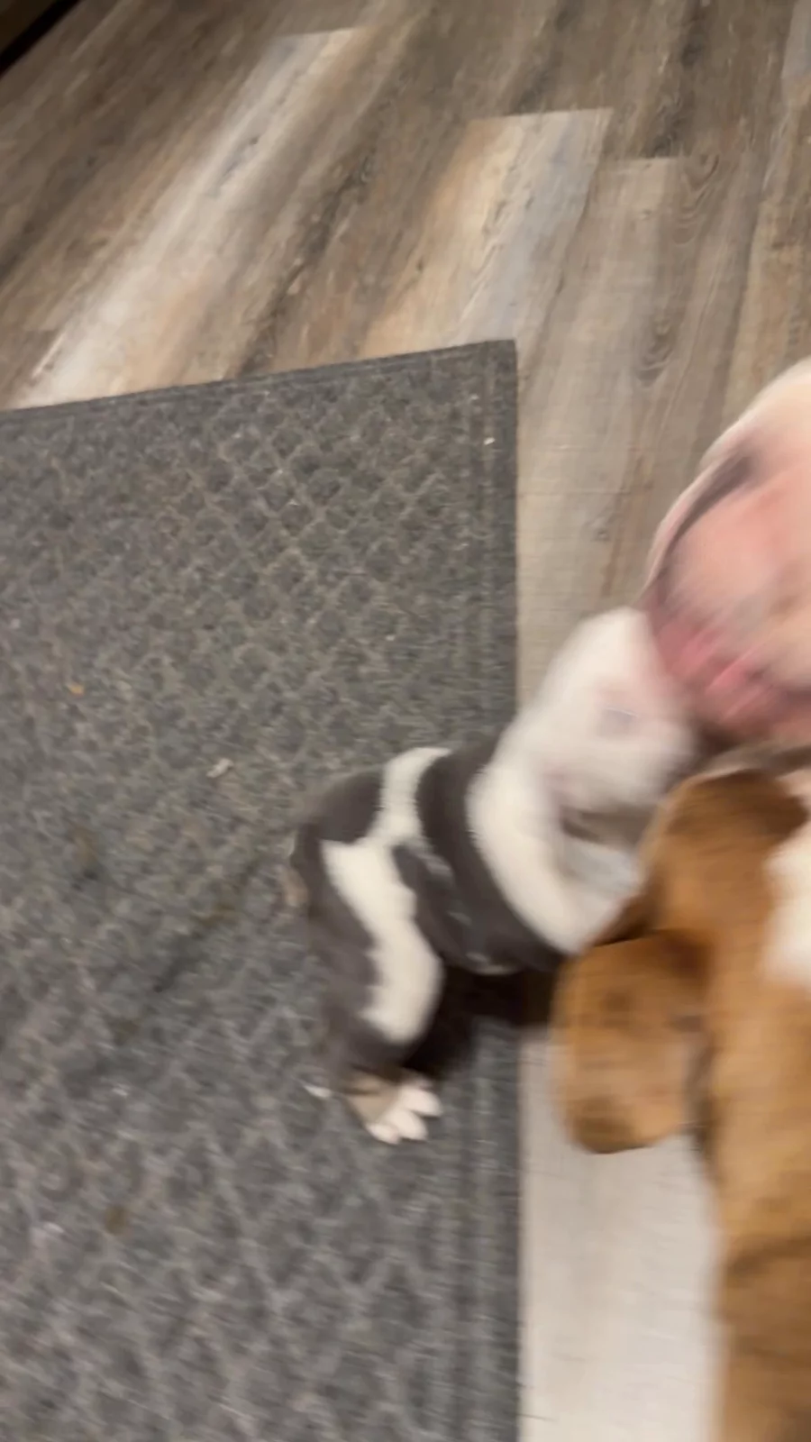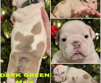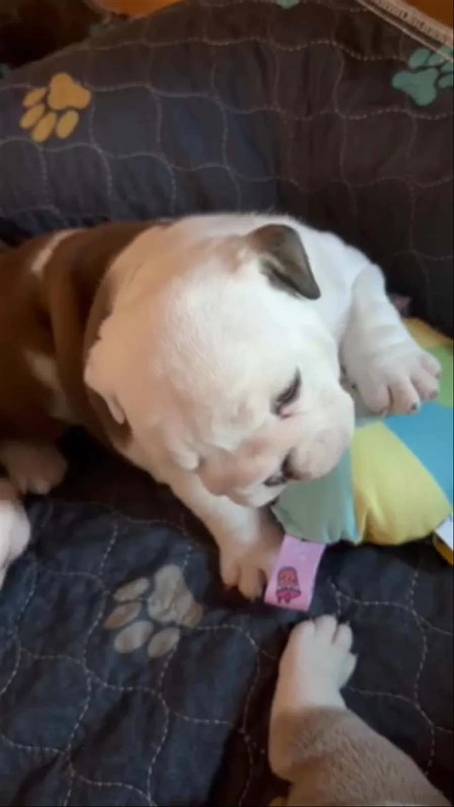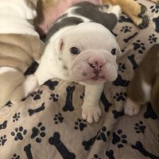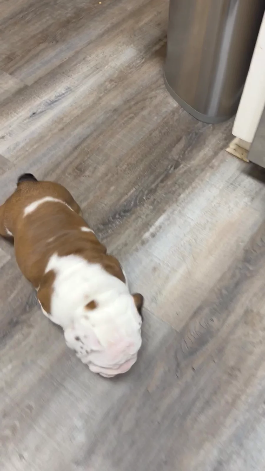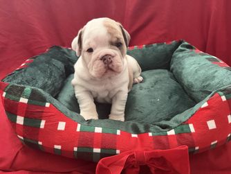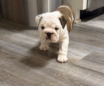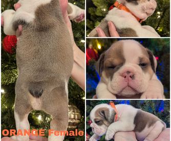 The girls are 4 weeks old today 11/20/25 and are doing wonderfully! They are getting better each day learning to walk. They have started the transition to mush and then top off on mom. They had their 2nd round of dewormer today and will have the final dose at 6 weeks when they also have their health check and first set of vaccines. They are starting to have their own personalities and also starting to play more verses just sleep and eat. They will be running around the house playing with the other English Bulldogs in my house in no time. Their favorite pass time is still eating, sleeping, and snuggling with mom or with me and my husband. I hope to be able to start potty training around week 5.