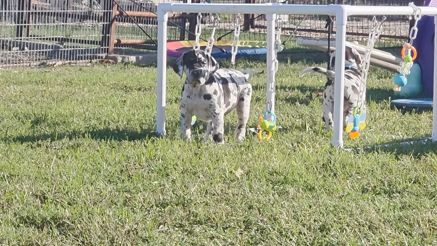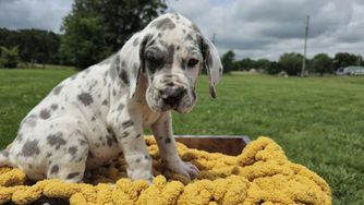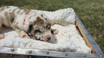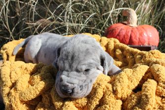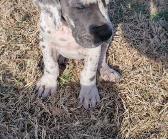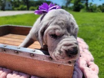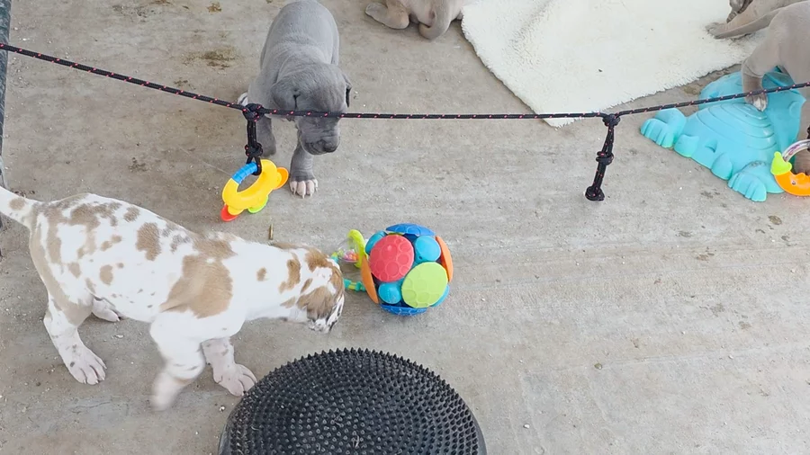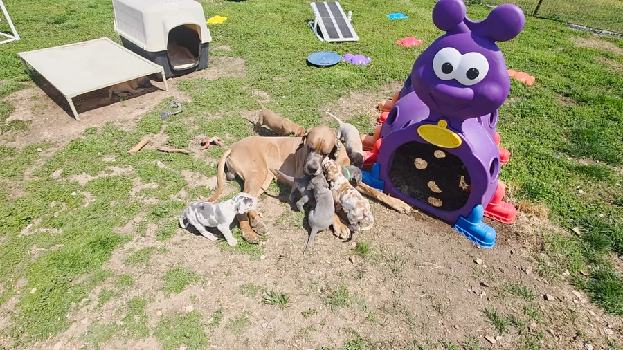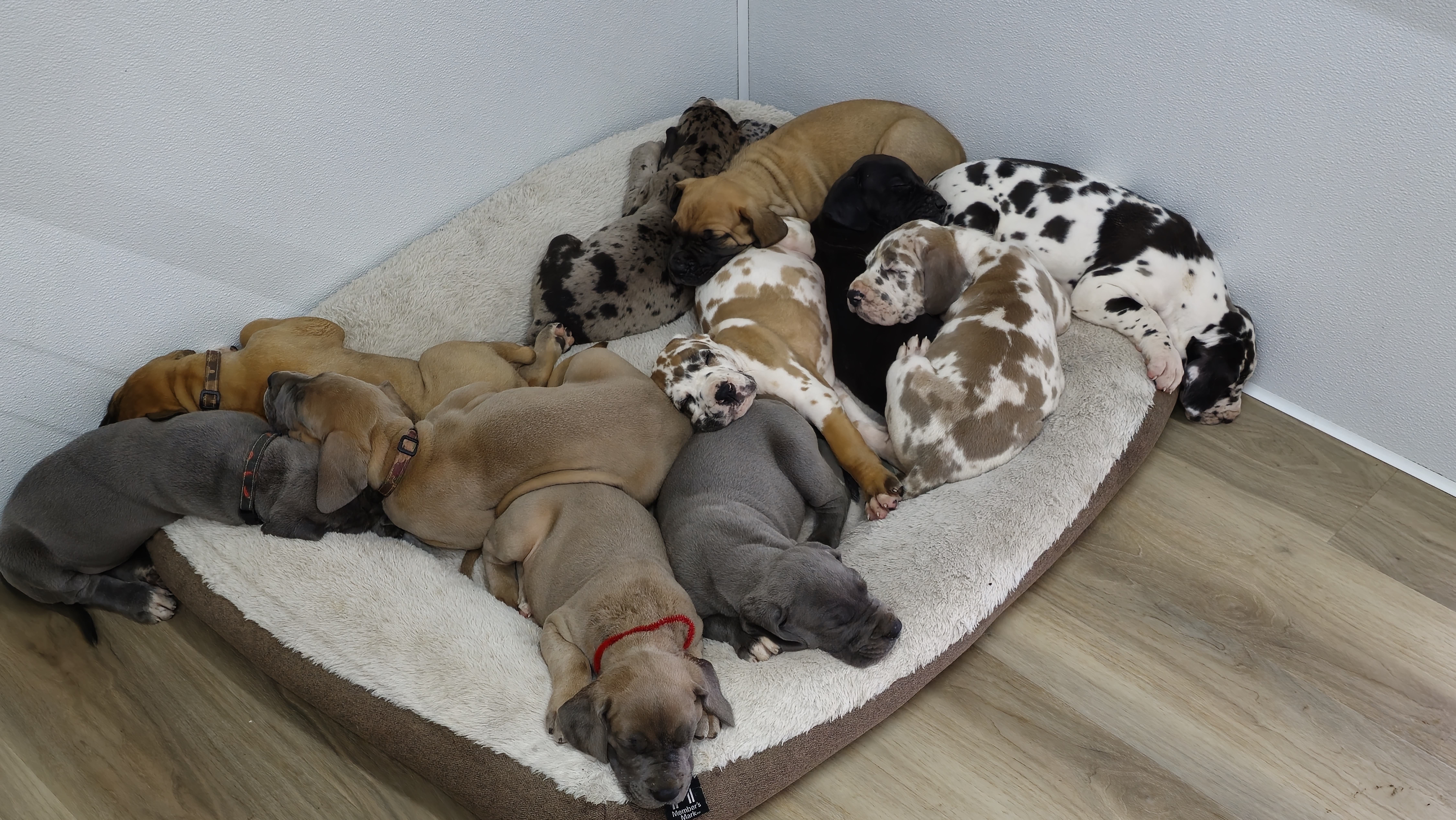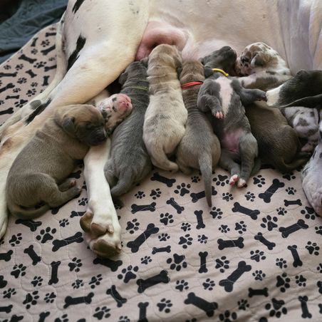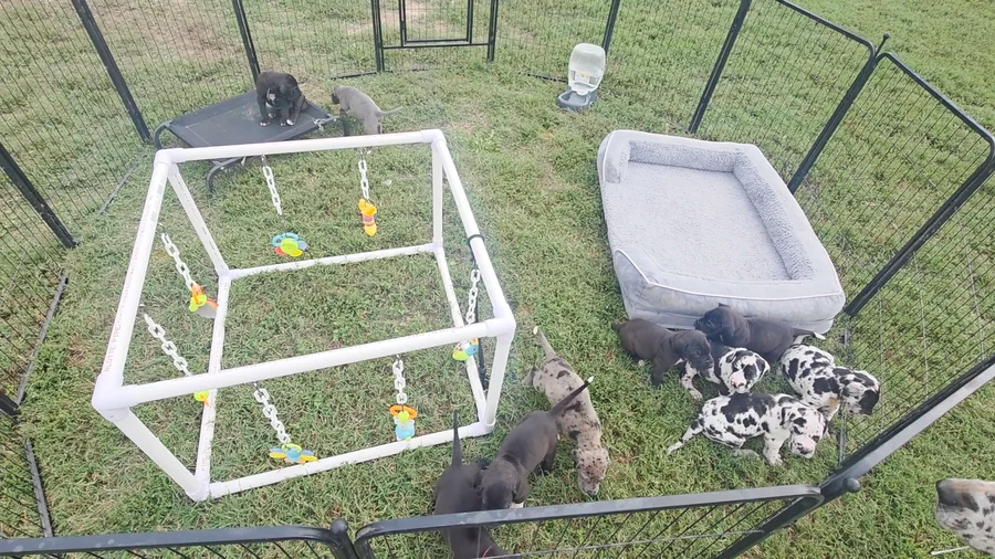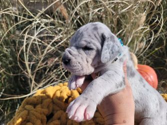 Our puppies include blue and white, fawn, blue, harlequin, merle, and black. Colors will vary depending on the parent dogs.