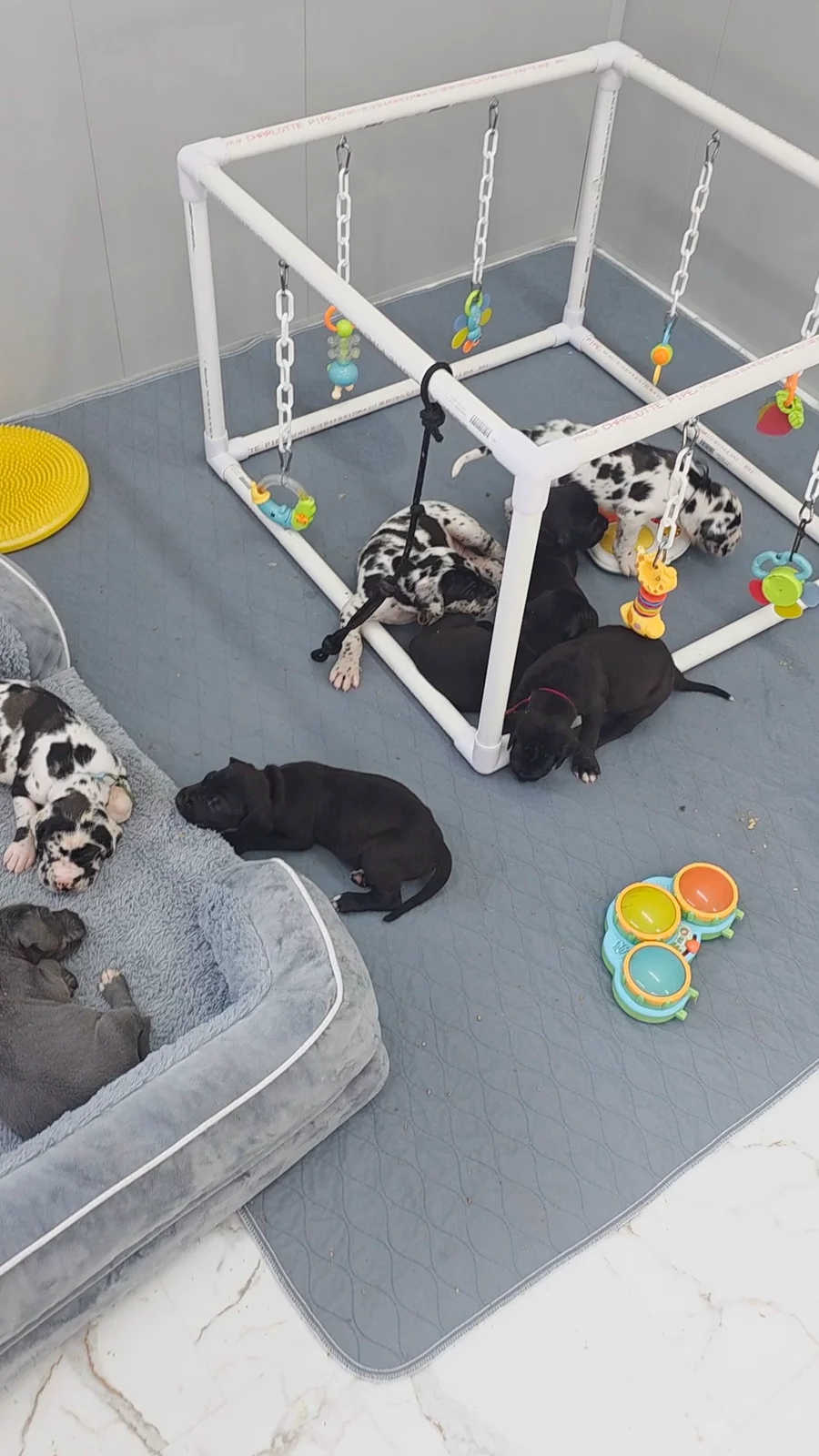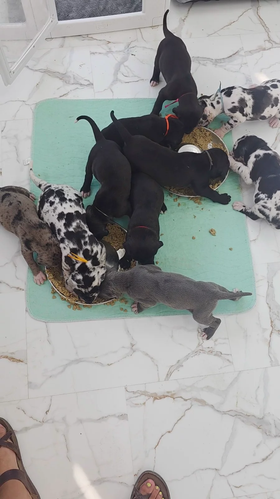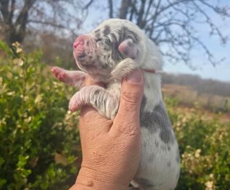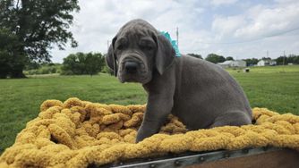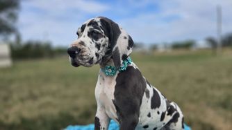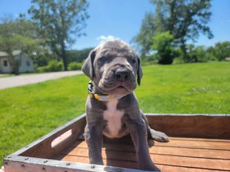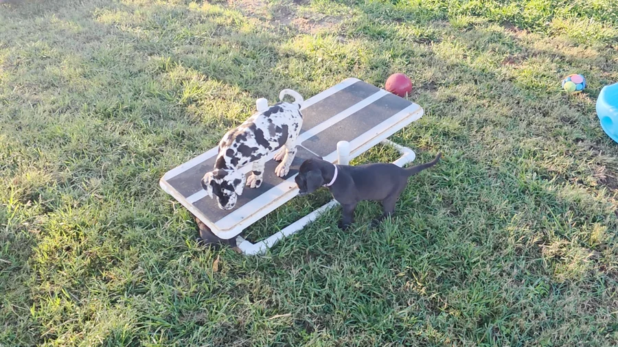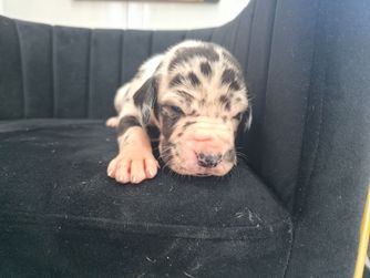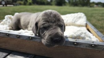 Our puppies include blue and white, fawn, blue, harlequin, merle, and black. Colors will vary depending on the parent dogs.
