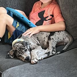 Kora (or Mushroom), is my 2nd dane and my first one from Jes at HCR. I put a lot of thought and time into finding a reputable breeder and couldn’t be more grateful to have met her. Becoming Kora’s mom has been one of the best decisions I’ve ever made. It is IMPOSSIBLE not to love her. She is so brave, eager to learn, the best cuddle buddy, and so so gentle (even by puppy standards!). Everyone meets her and immediately comments on what a sweetheart she is. Jes has made this process so easy, and is always quick to respond to any tiny concern, question, or even Kora update I have for her. You can genuinely tell that she has such a love for this breed and the dogs that she helped raise, even when they’re miles away. I love being able to share my excitement with her on Kora’s milestones, and couldn’t feel more blessed that I came across her profile. I would 100% get another dog from Jes in the future, and have already bragged on her to so many other people who have fallen in love with Danes because of Kora. Jes, thank you for gifting me with my bestfriend!