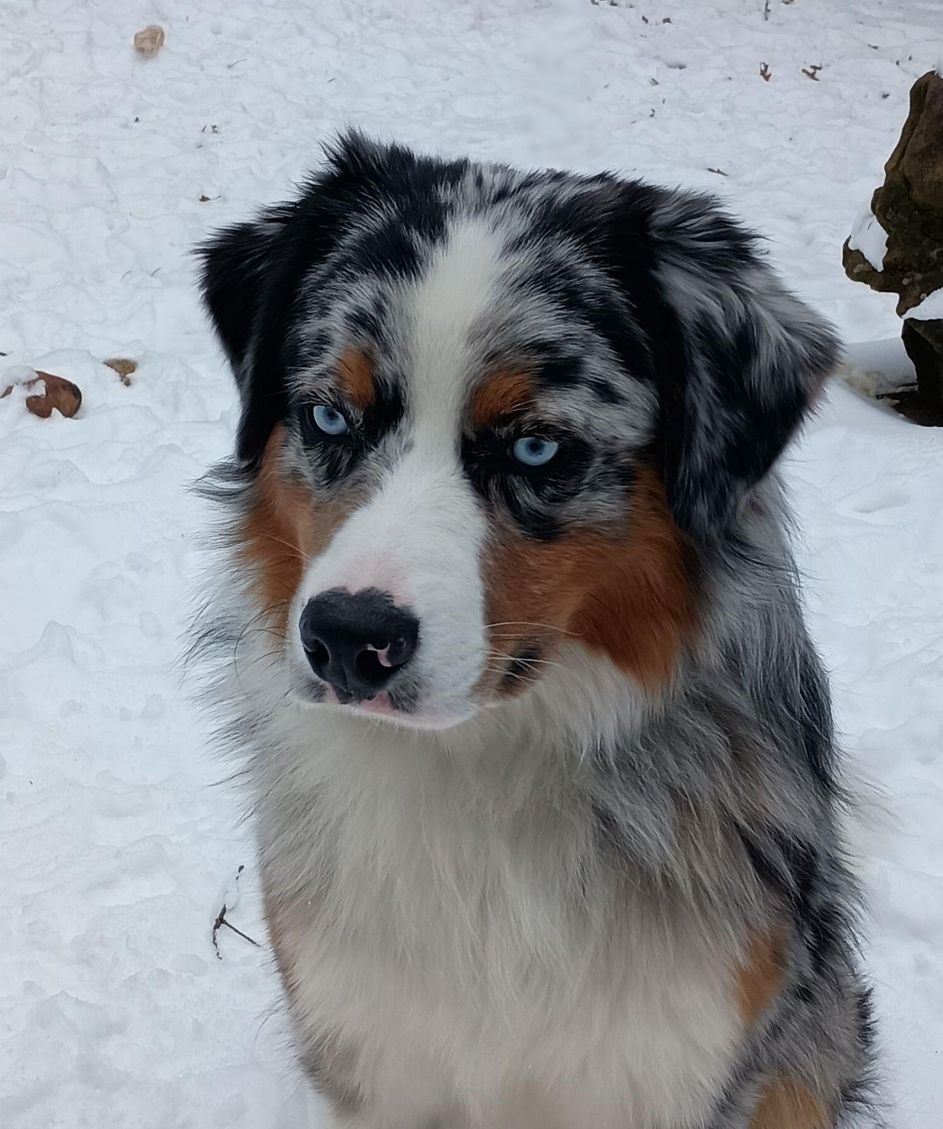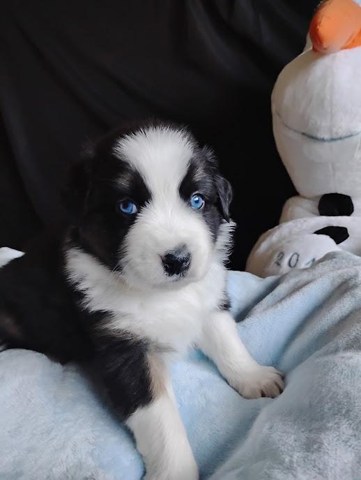 Radon is a sweet. gentle male who loves the old fashioned game of chasing sticks. He is always happy and has a wonderful good natured personality. He loves everyone and is famous for bumping our hands up to get some pets and affection. Radon has a thick beautiful blue merle coat and full tail. His coat is especially soft around his neck and chest.