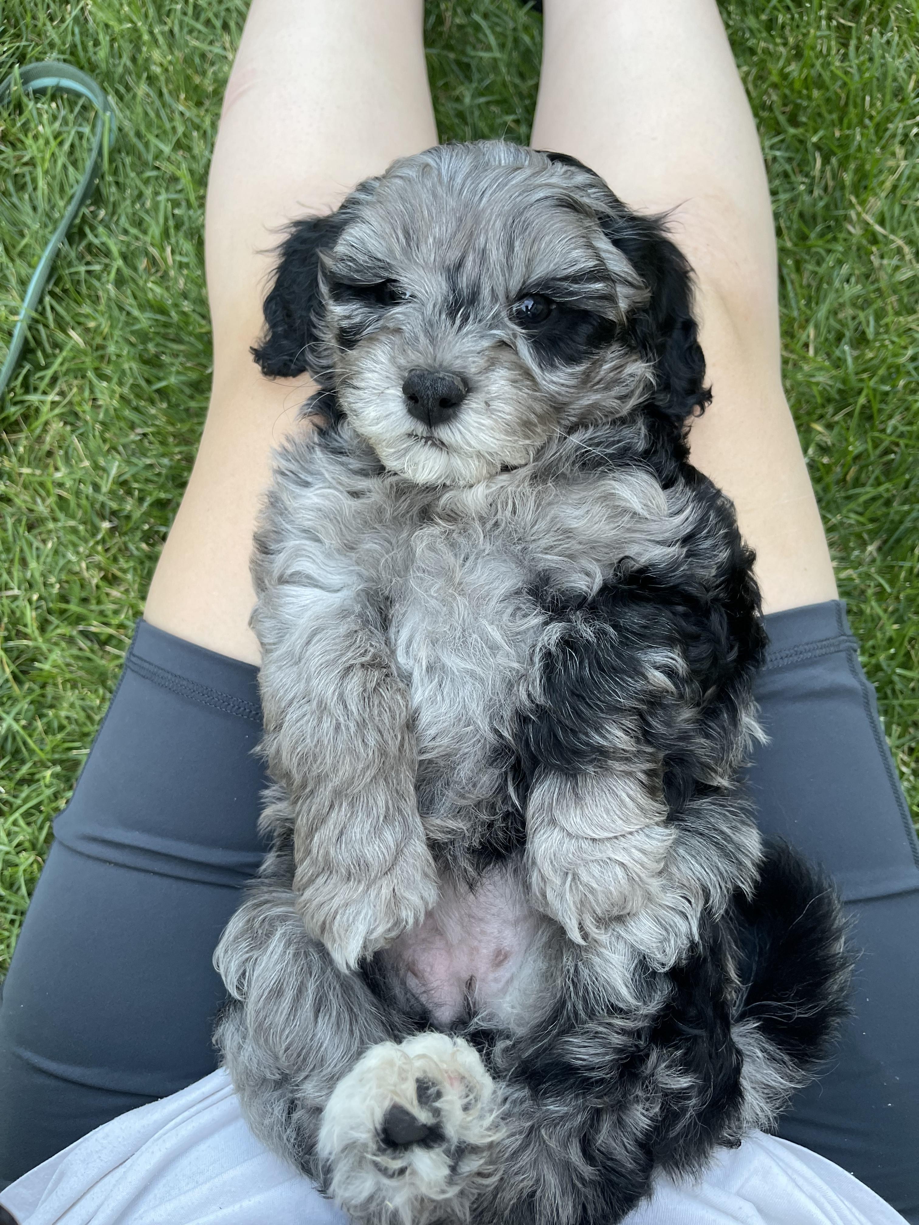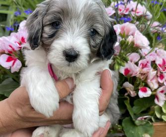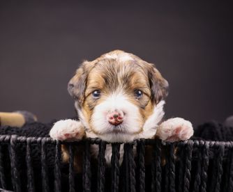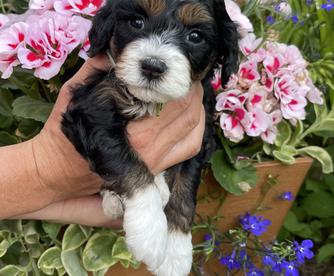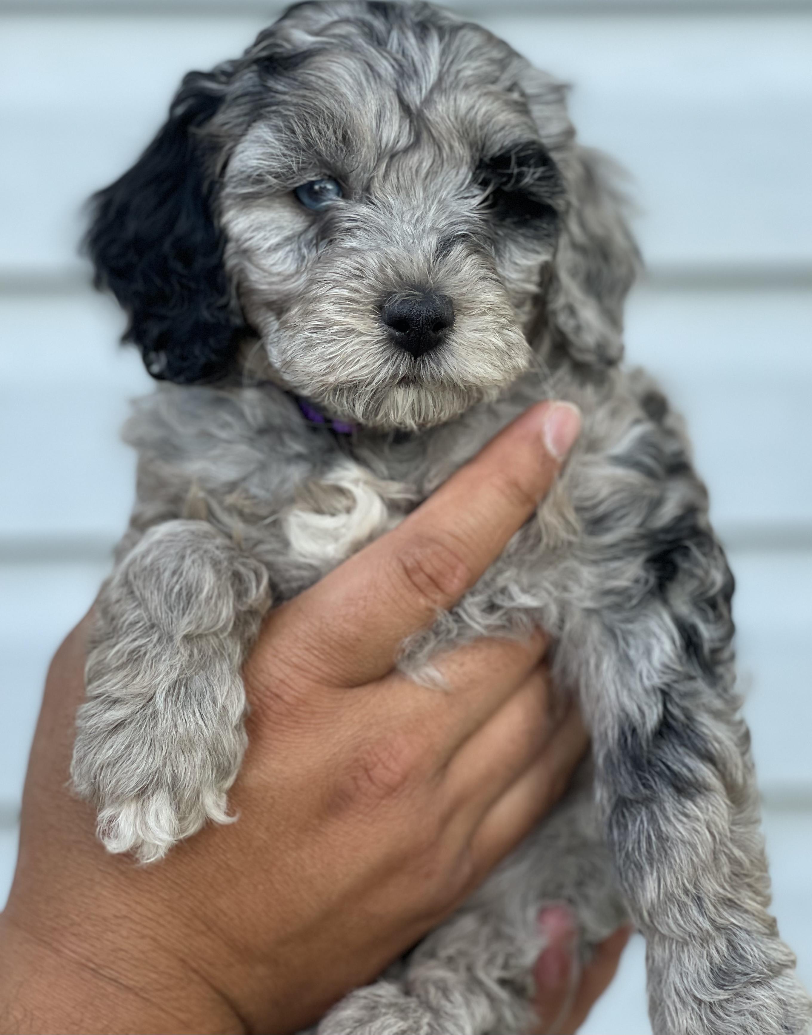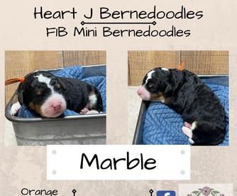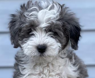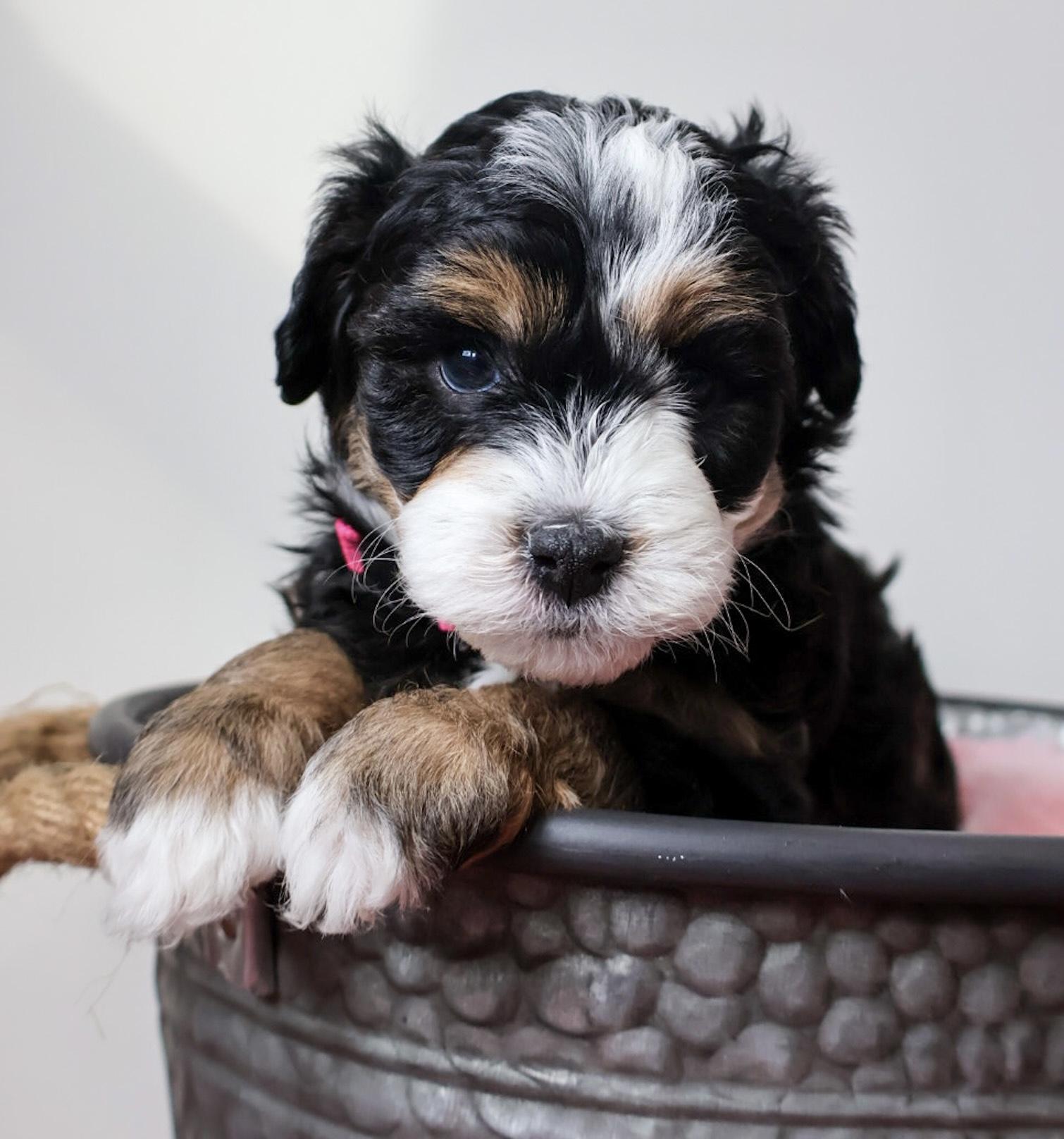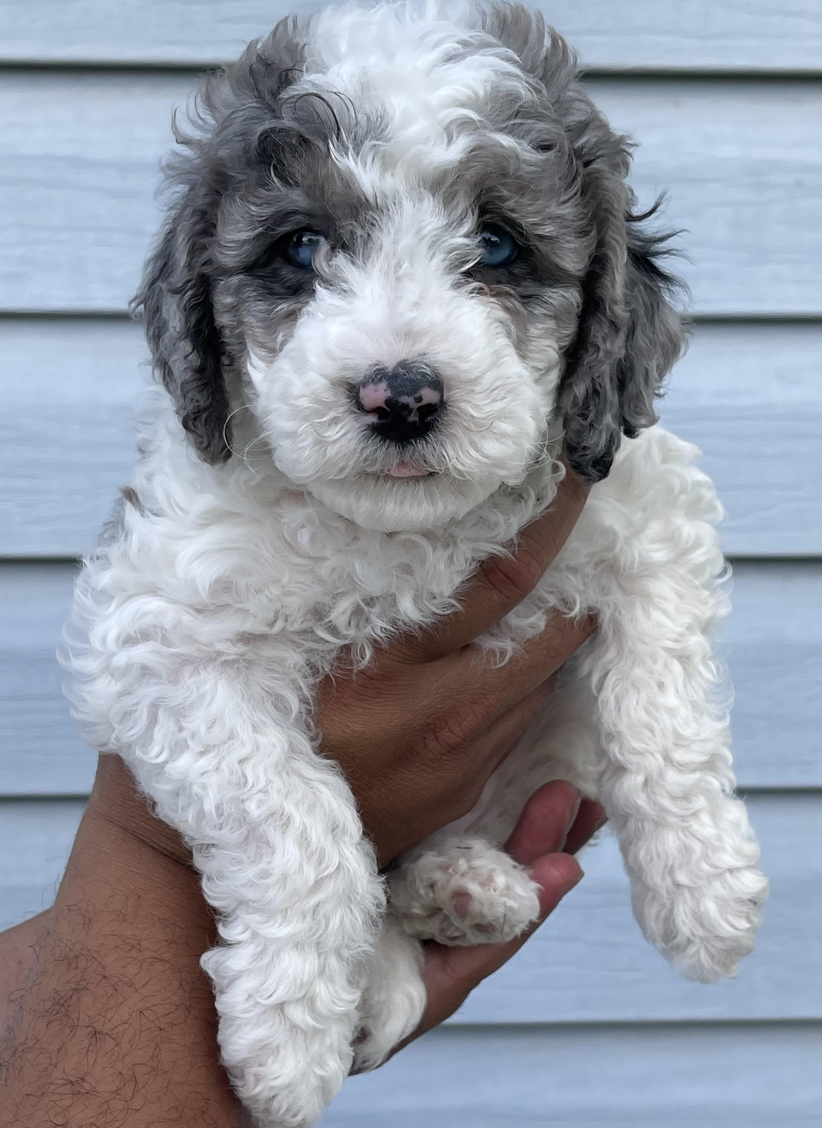 Our Bernedoodle puppies include sable, black and white, and tri-color. Aussiedoodle puppies are blue merle. Colors will vary depending on the parent dogs.