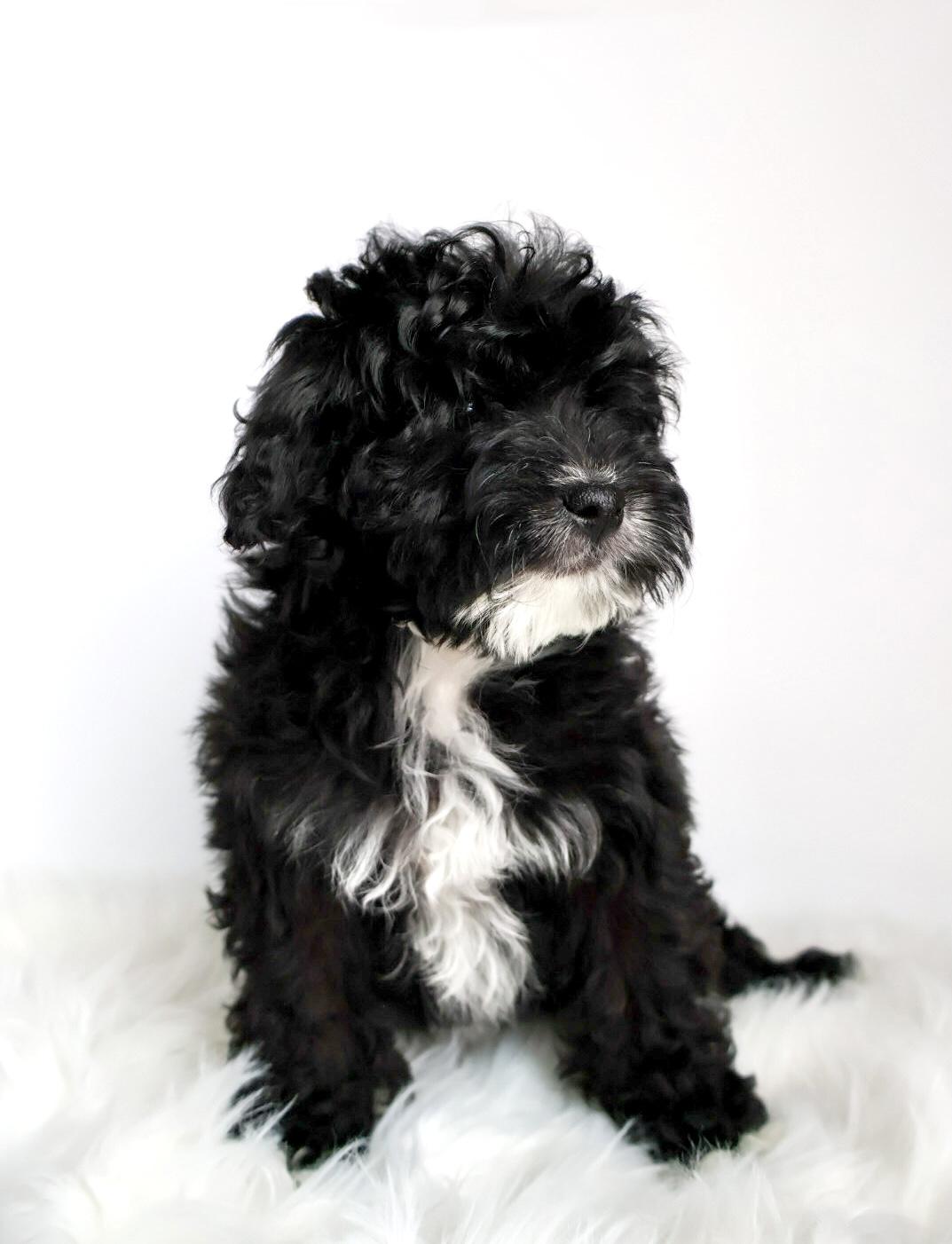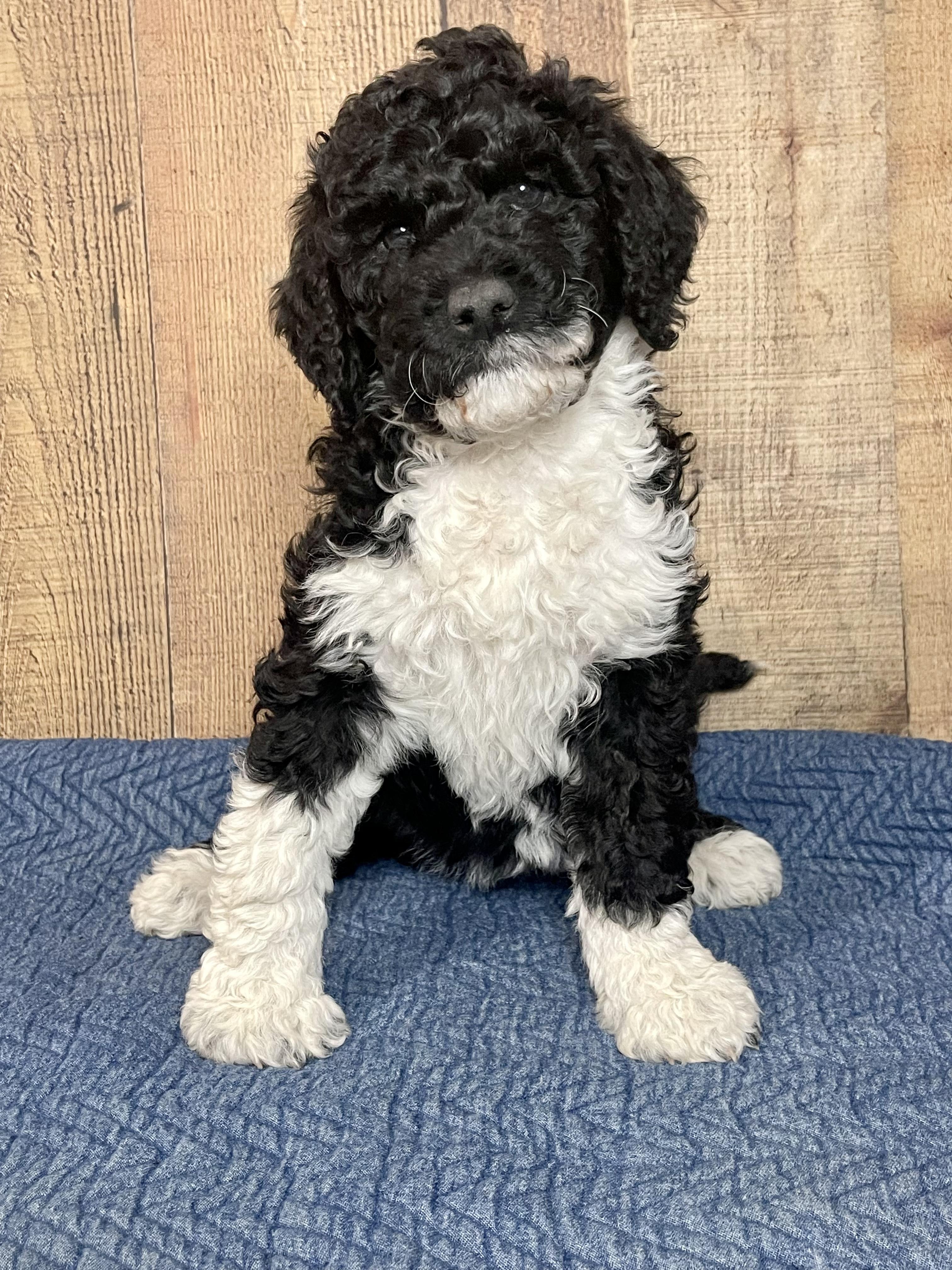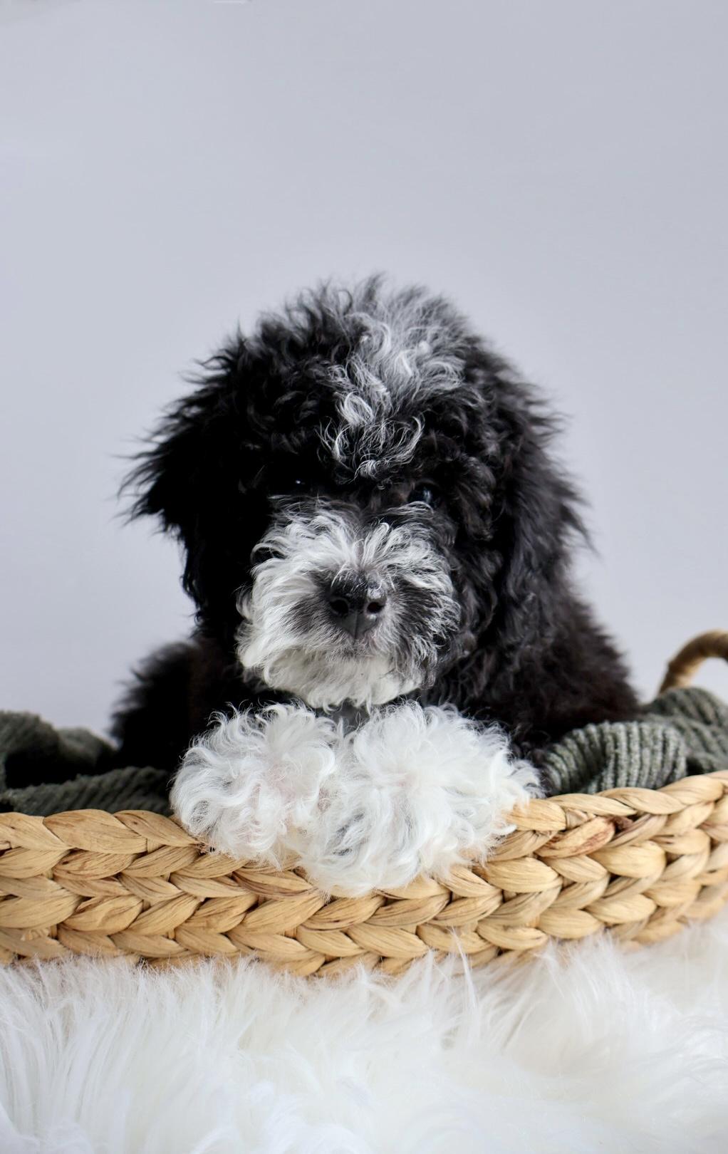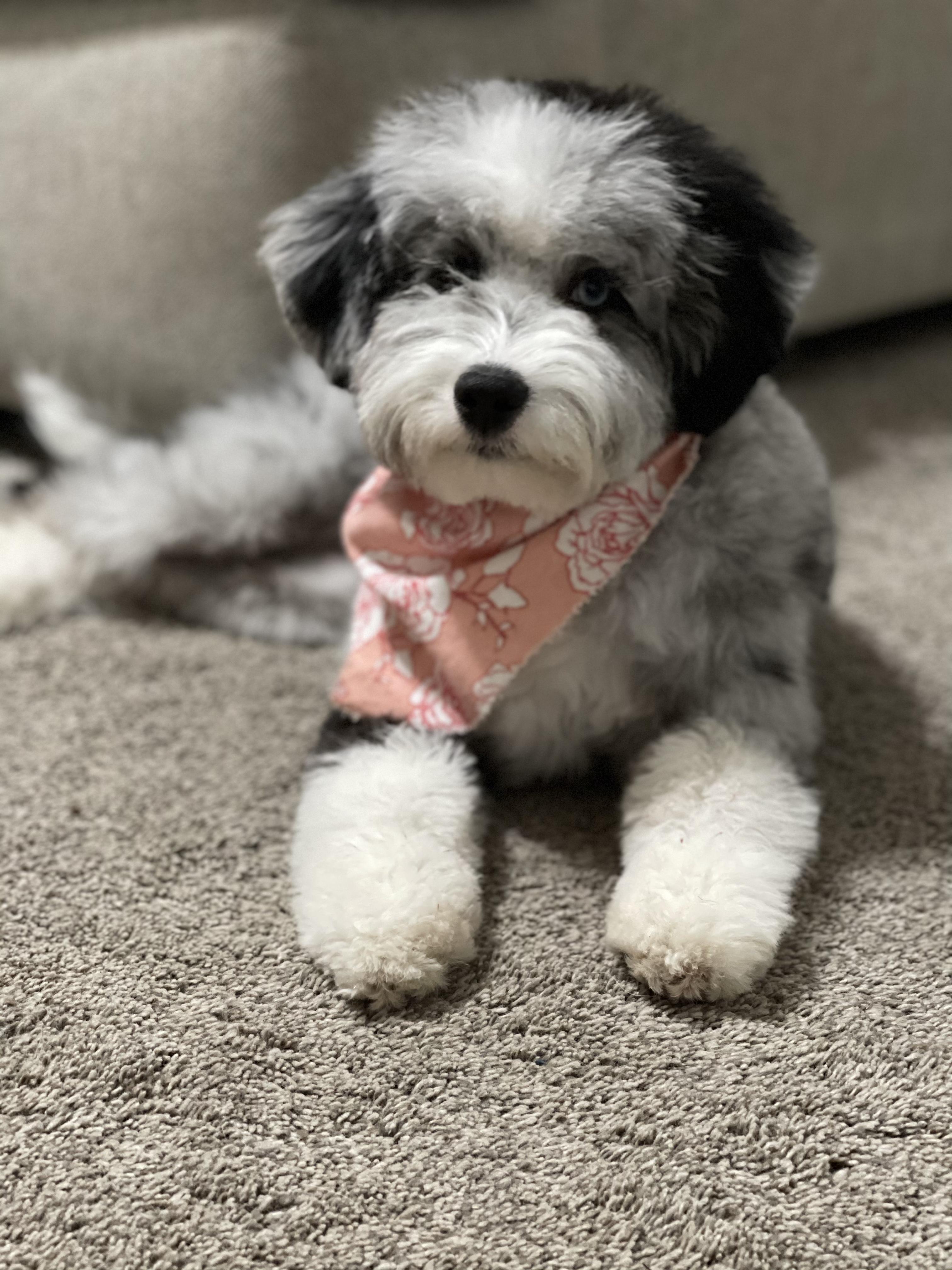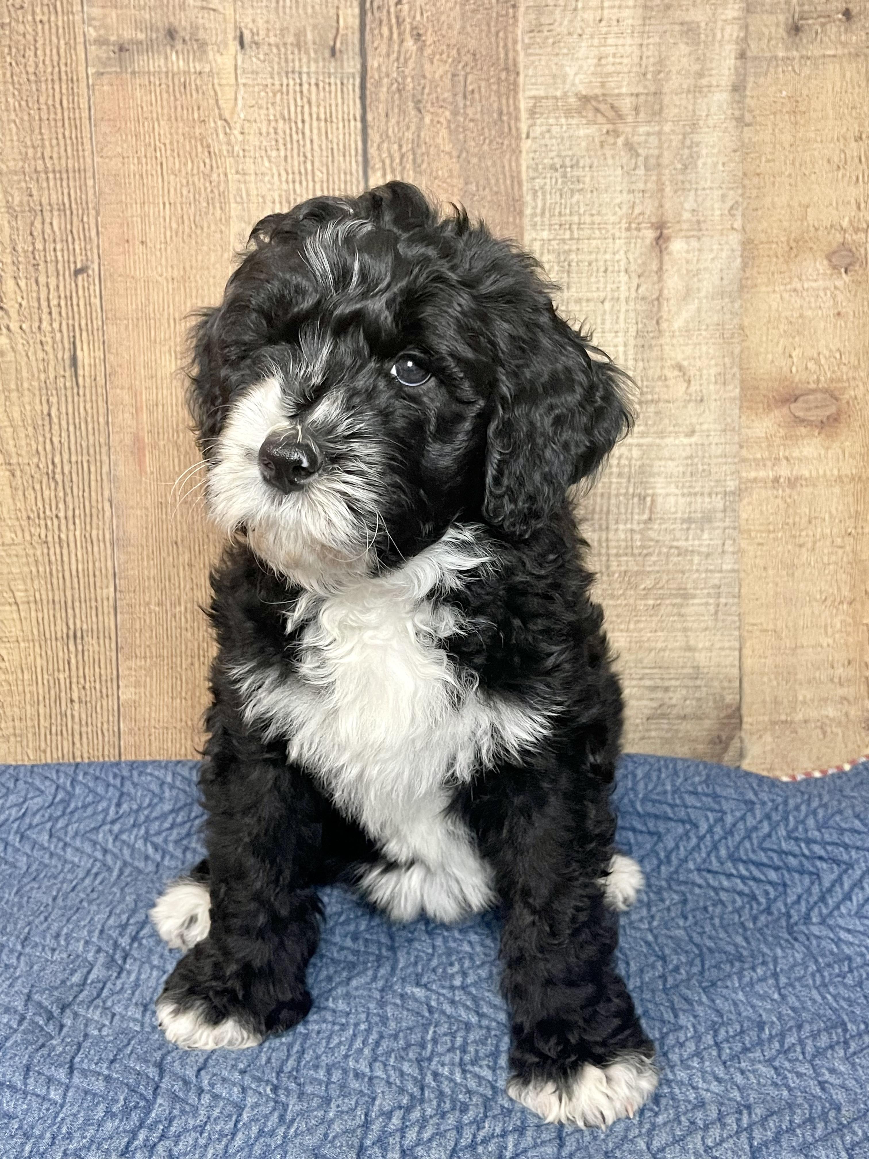 Our Bernedoodle puppies include sable, black and white, and tri-color. Aussiedoodle puppies are blue merle. Colors will vary depending on the parent dogs.