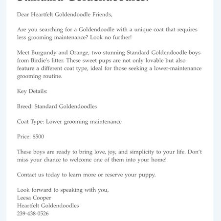 I'm Leesa C., the breeder behind Heartfelt GoldenDoodles located in Krum, TX. Looking to add a new addition to your family? Look no further we have your new best friend. Family born and raised Golden Doodles! Sometimes the most ordinary things can be made extraordinary simply by doing them with a Golden Doodle.