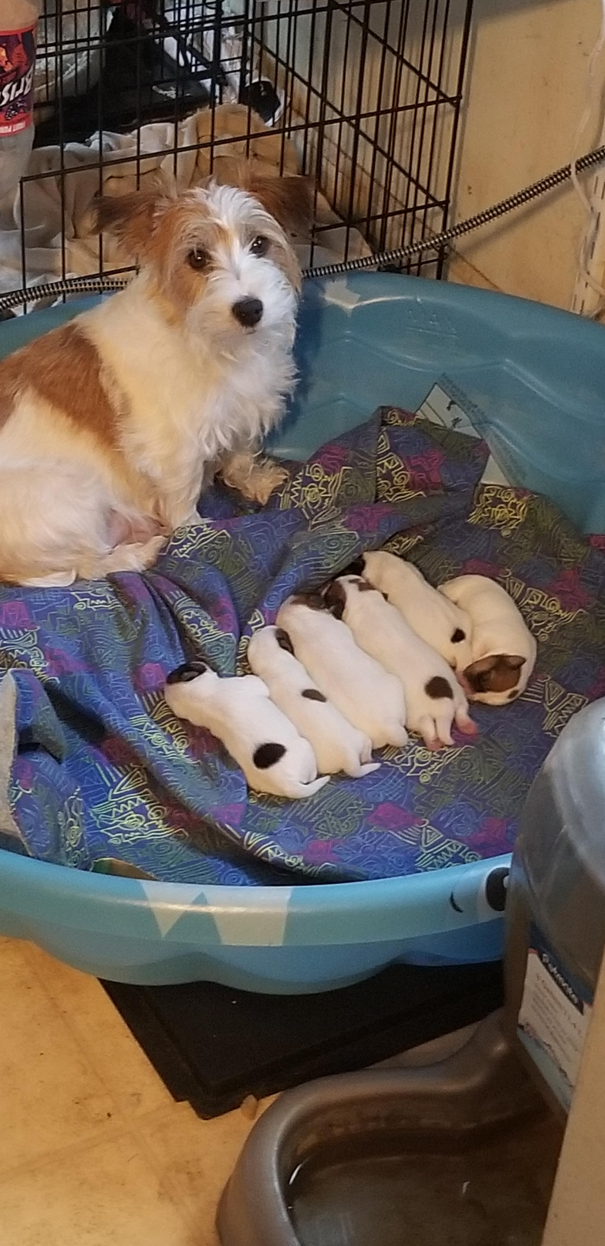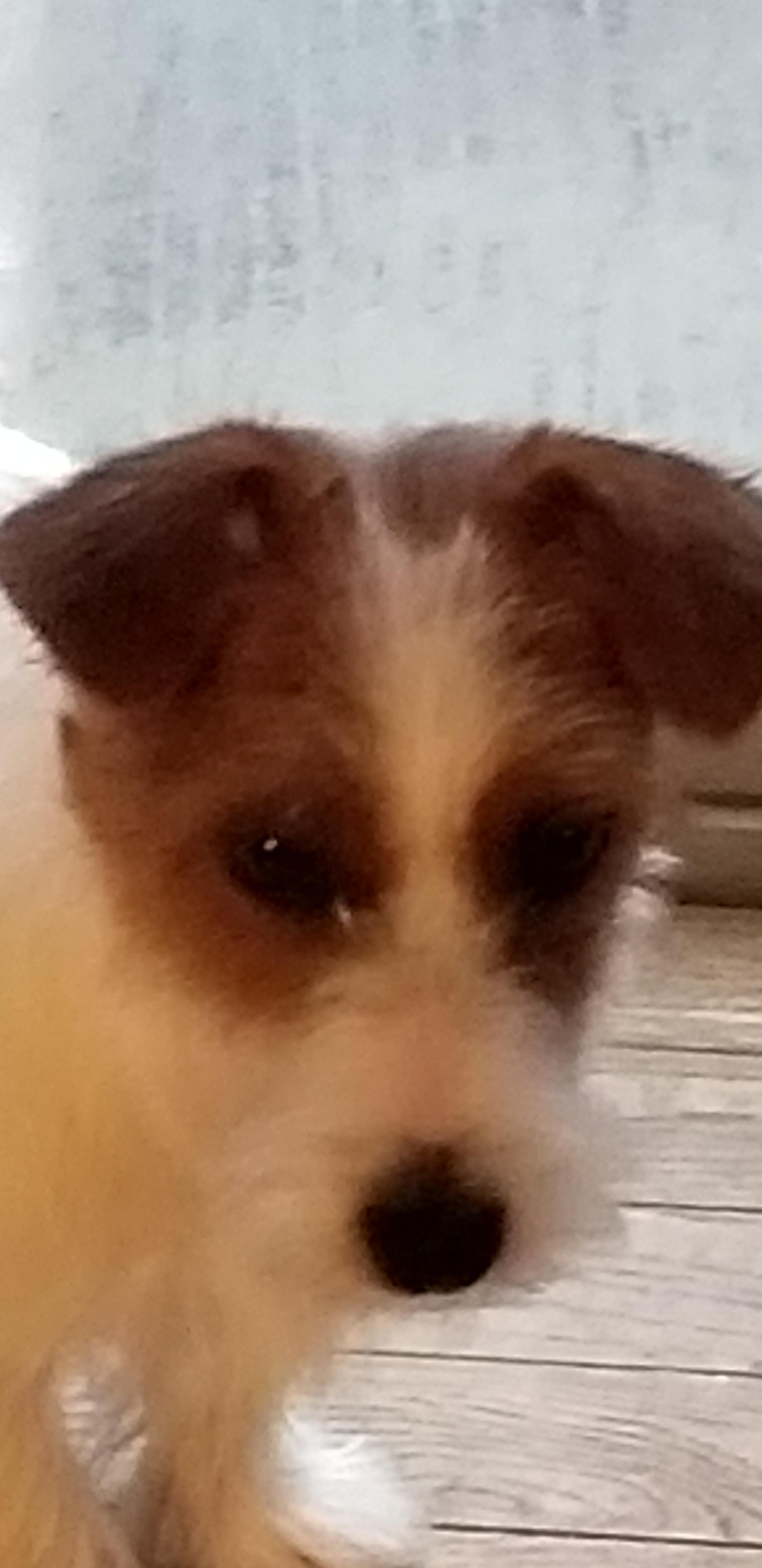 Petite female 10 1/2 inches tall, about 13 lbs., rough coat, Tan and White. Aurora is my "Heart" dog. She is my foundation bitch, my first Russell Terrier. We have learned a lot from each other. This is her third litter and I have delivered everyone as she and I are so bonded she expects me to be her mid-wife. I showed her to her Championship myself. I promised her she wouldn't have to ever show again once she finished, she didn't like being in the ring or the grooming I'm not sure which one she hated more. She's a wonderful mother, a great companion and a snuggle bug.