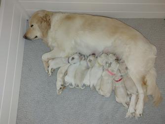 My parents bred and showed AKC Shelties when I was growing up. My mom was squeamish and my dad was in the military and often away for training or deployment so I was delivering pups at just 16 years old! As an adult, I fell in love with the Golden Retriever breed and felt every famiky should have one so I decided to get into breeding too. I have been doing it for 15 years now!