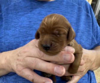 Luna is a female Irish Setter. Carefully selected as a great representative of her breed, John and Patty decided to make her part of their program. John and Patty has passed Good Dog’s screening process, which involved a review of their breeding practices, environment, and the mental and physical health of their dogs.