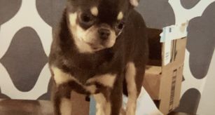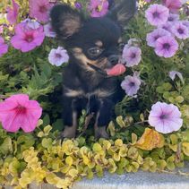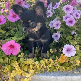 Wendy is a lovely marked black/tan with white markings chihuahua. Her Mother was a long coat and dad was a chocolate/tan Russian import chihuahua. Shes a very outgoing girl and a great Mother. Her Mother was a long coat.