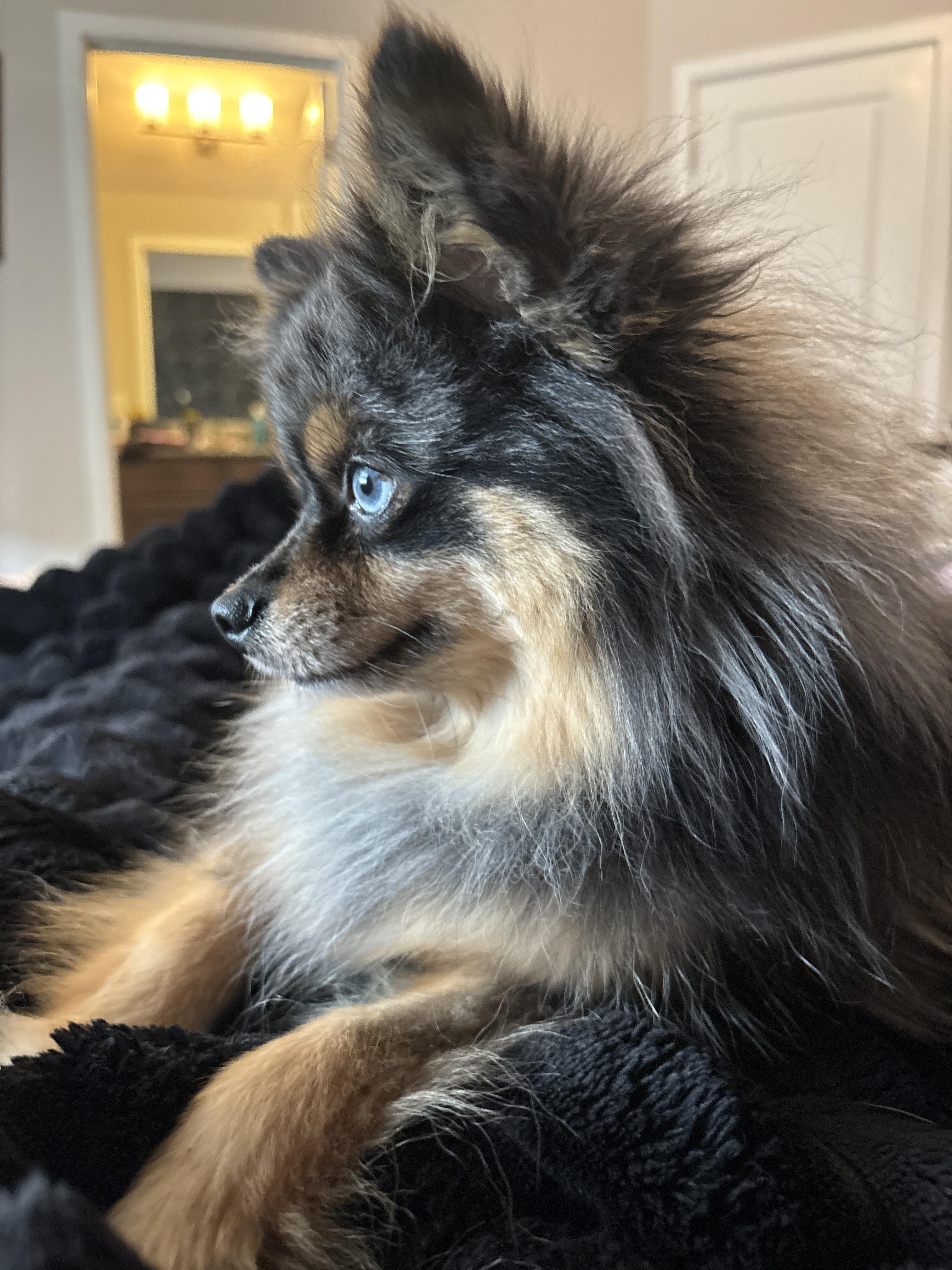 She’s confident, loving, and wonderfully gentle with puppies and people alike. Whether she’s curled up for a nap or bouncing around the house like a tiny queen, her presence fills the room with joy.