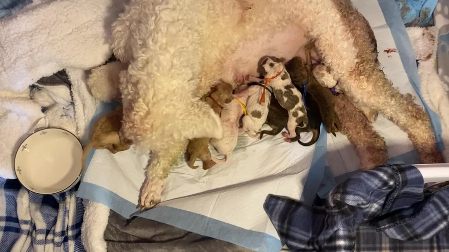 3 week pictures are uploading in the next couple days. Doing sleeping or laying on their backs for this week to show off their beautiful markings. Mom is a Parti poodle, dad is a solid. Was expecting some markings. These are really beautiful.